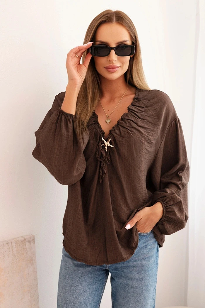 Dámská blůza s viskózou s model 21266190 výstřihem a ozdobou hnědá - K-Fashion