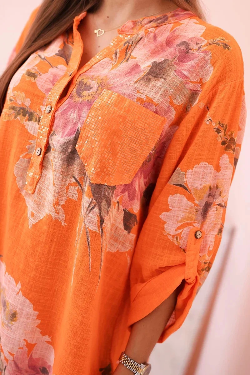 Dámská blůza z bavlny s květinovým vzorem a knoflíky - oranžová