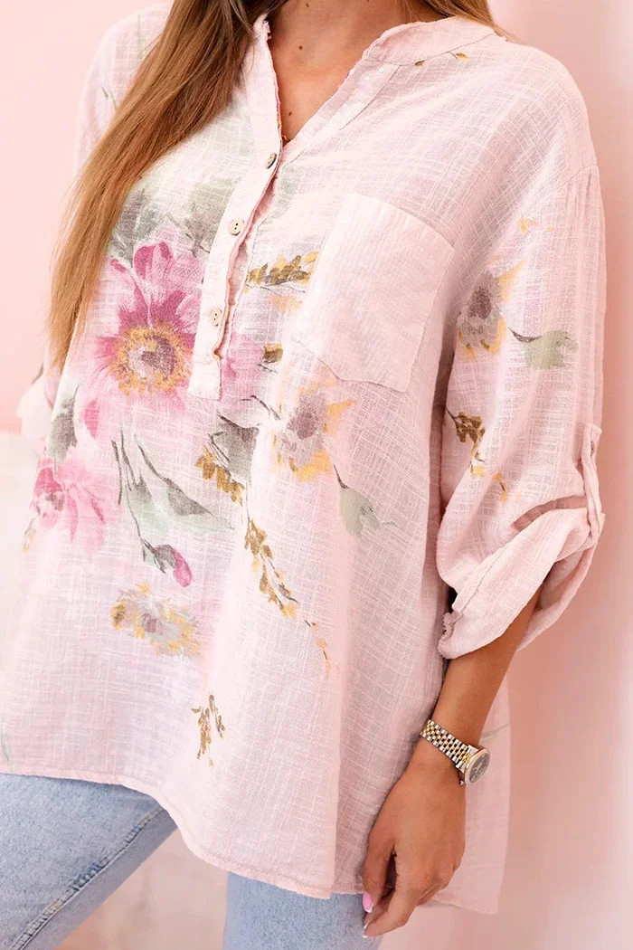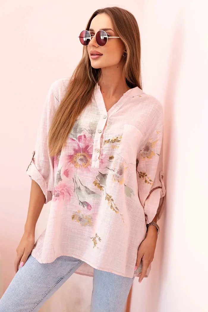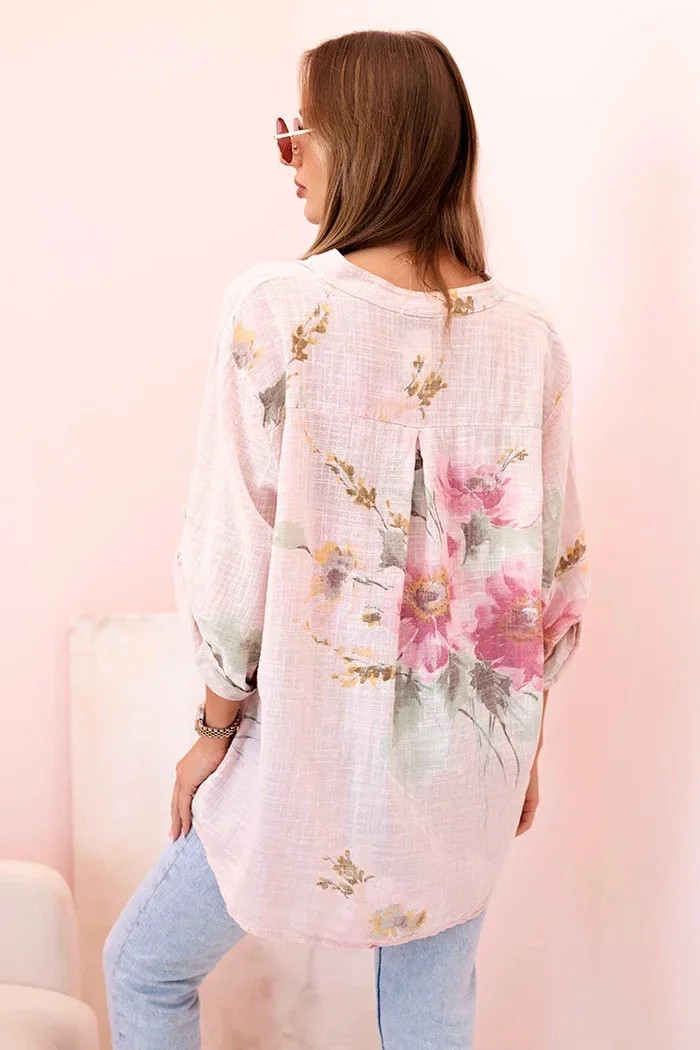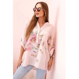 Dámská blůza z bavlny s květinovým vzorem a knoflíky pudrově růžová