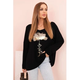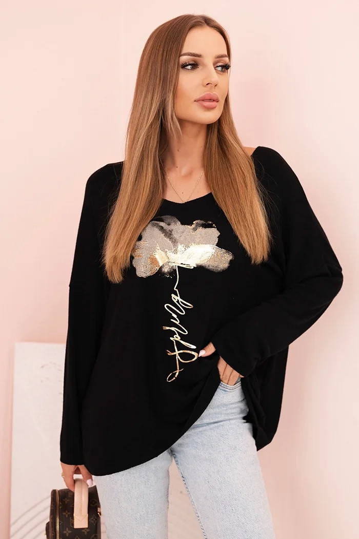 Dámská blůza z viskózy s dlouhým rukávem a zlatým květinovým potiskem černá