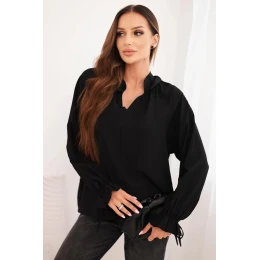 Dámská blůza z viskózy s výstřihem do V a vázáním u rukávů černá
