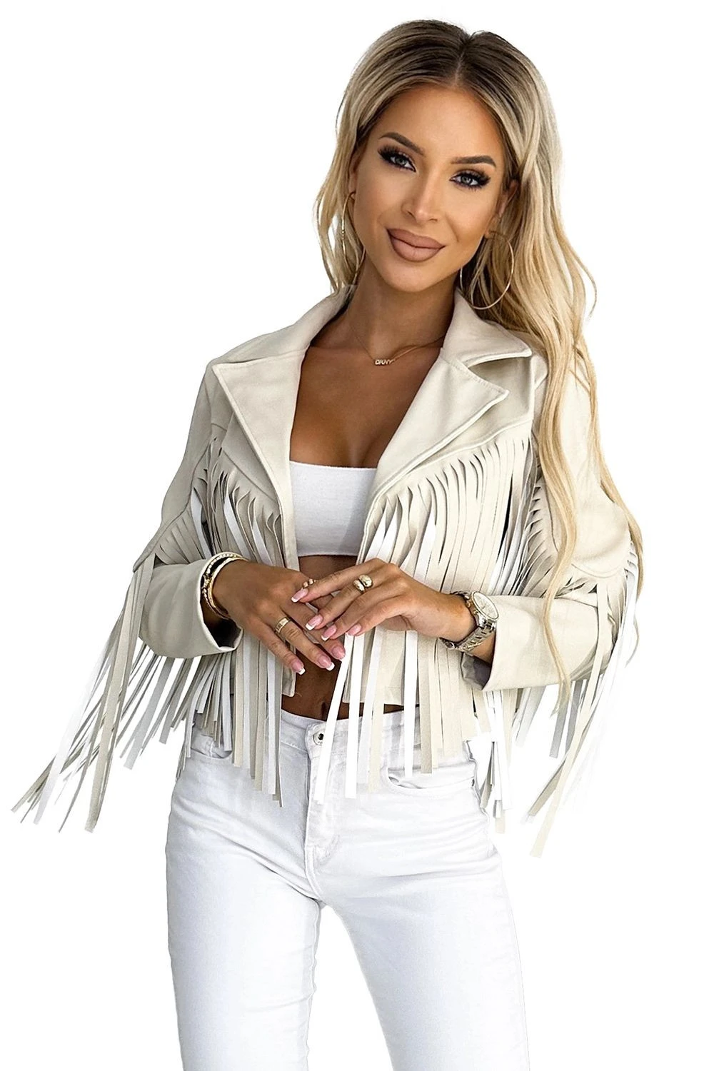 Dámská bunda 624-1 Numoco basic - béžová barva - efektní ramoneska - z vysoce jakostního materiálu - eko kůže - dlouhé rukávy - zdobené třásněmi na rukávech a na ramenou - vhodné na vycházky, festivaly nebo stylová setkání