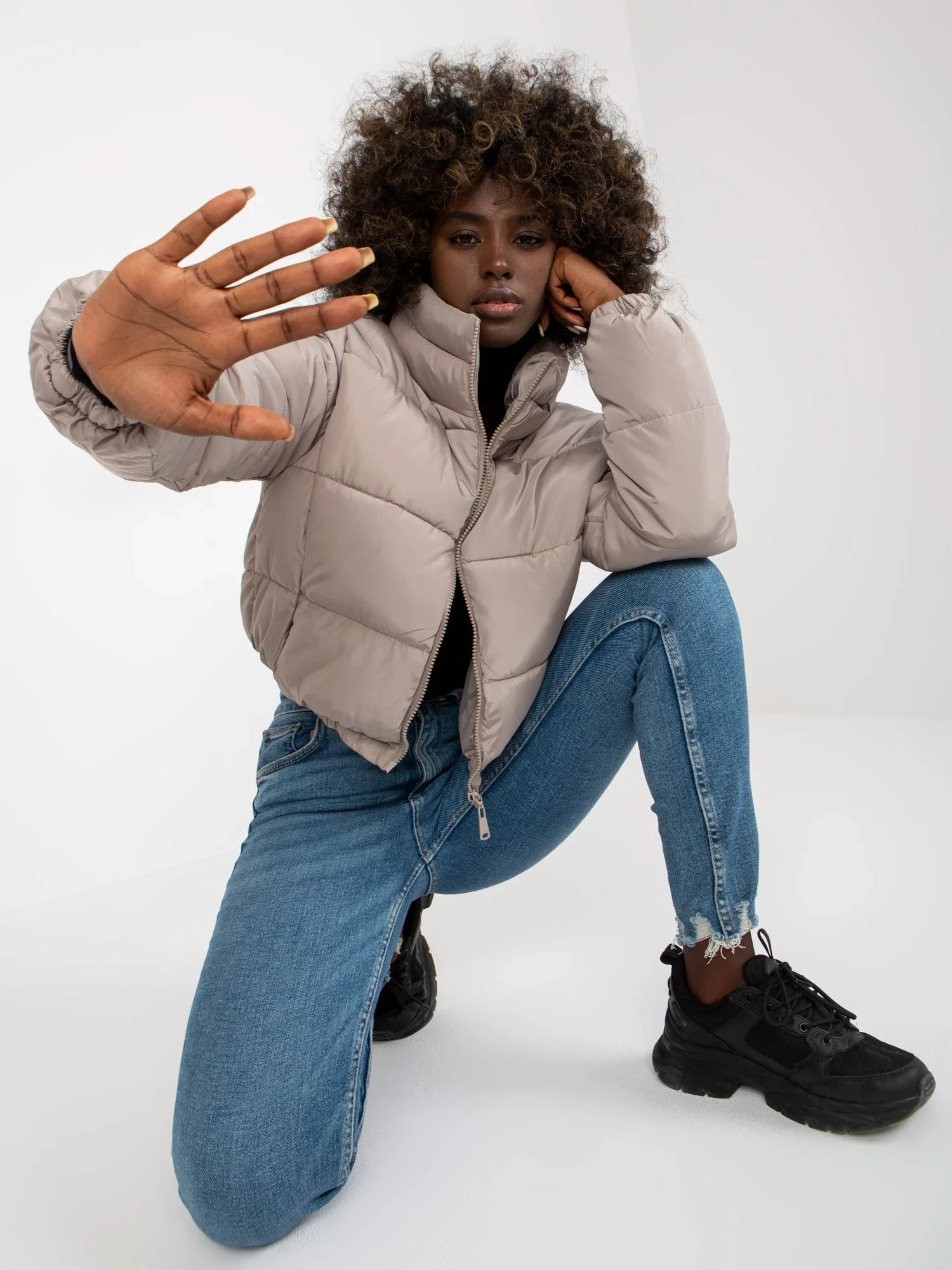Modelka má na sobě velikost S. Míry modelky: výška 177 cm, prsa 84 cm, pas 62 cm, boky 89 cm.