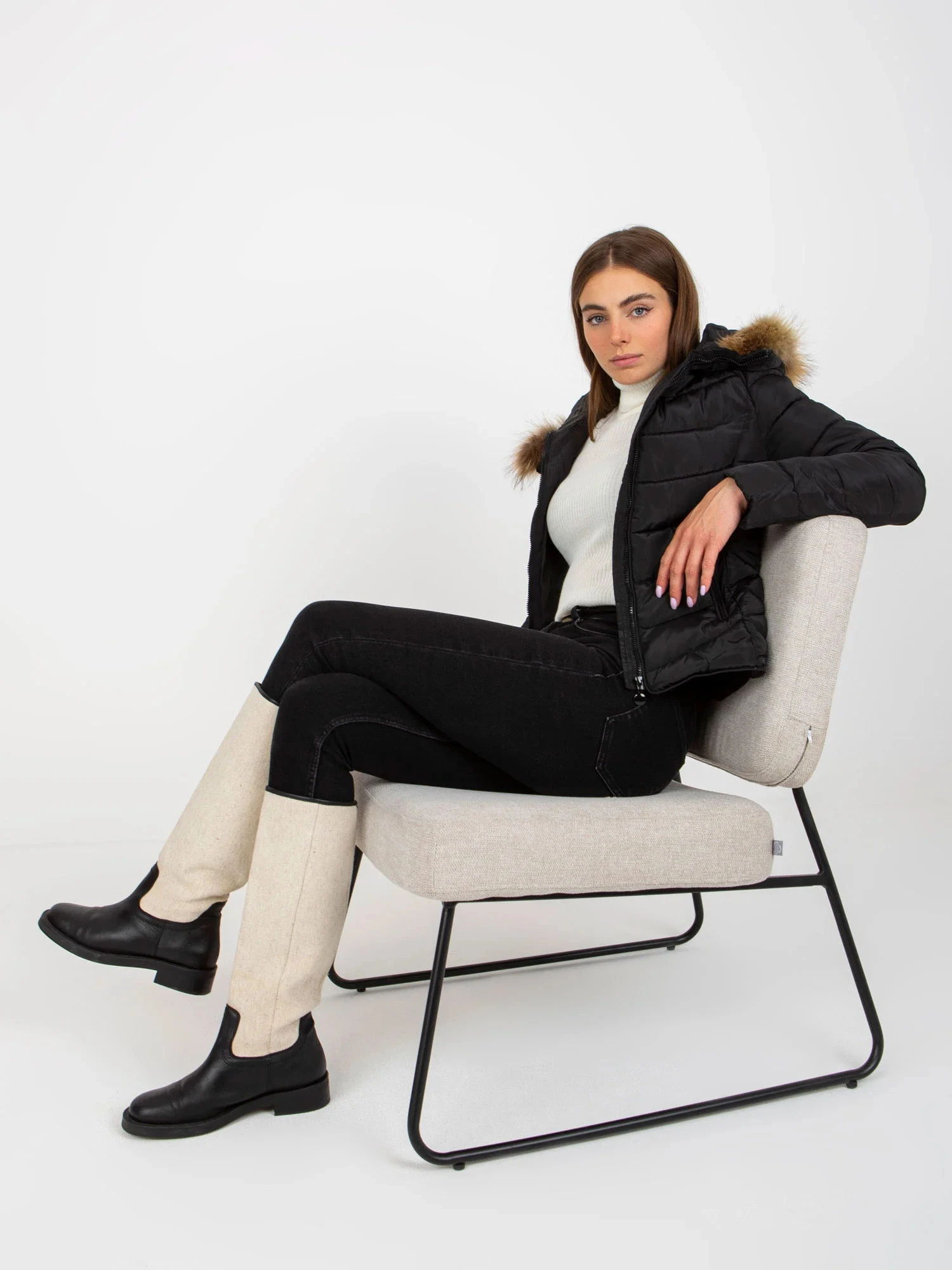 Černá prošívaná přechodová bunda s kožešinou na kapuci .
