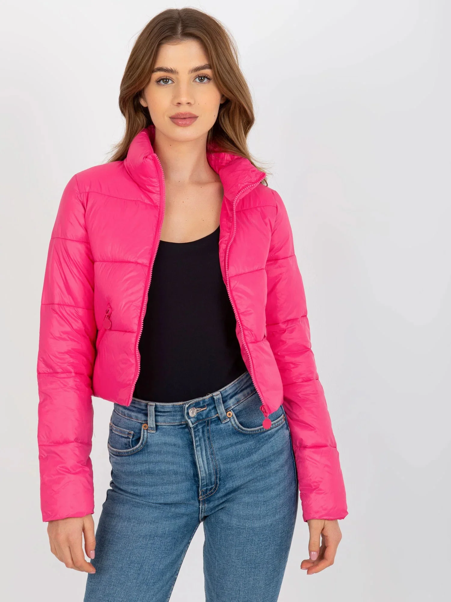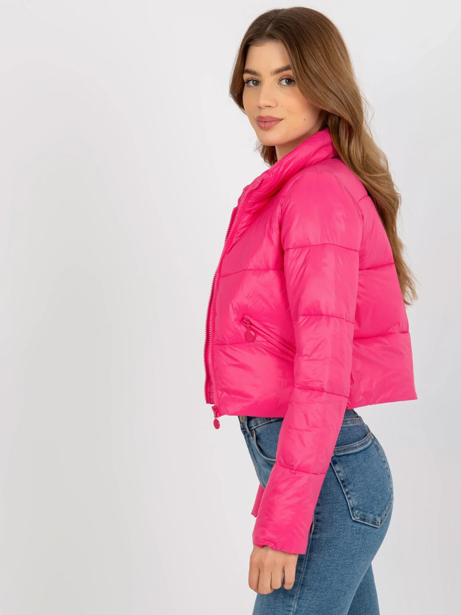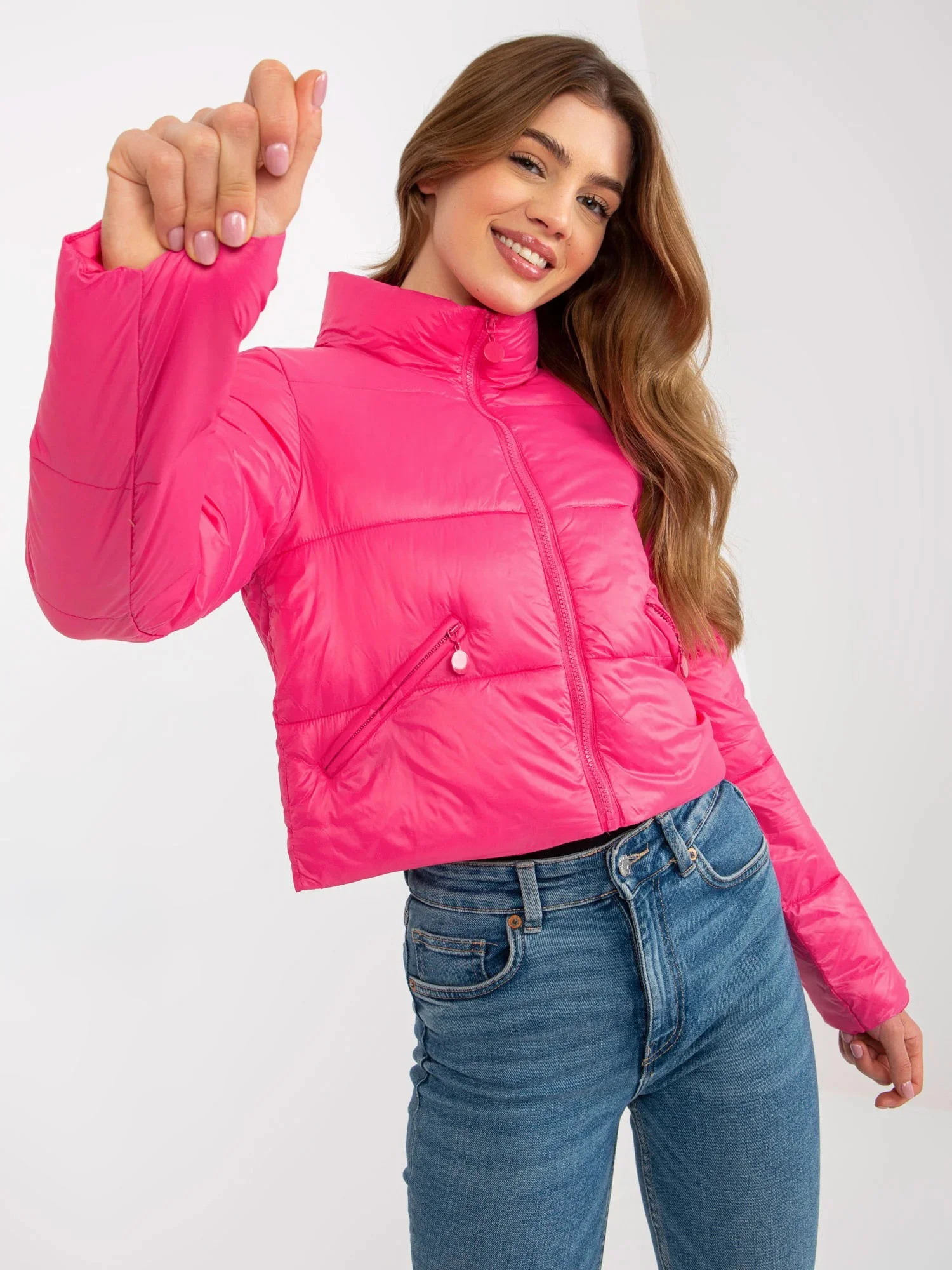 Tmavě růžová krátká přechodná prošívaná bunda s kapsami .