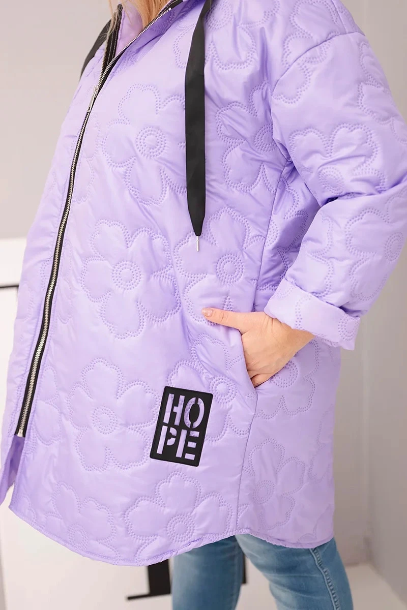Dámská bunda Plus Size prošívaná s kapucí a nápisem model 21808651 světle fialová - K-Fashion