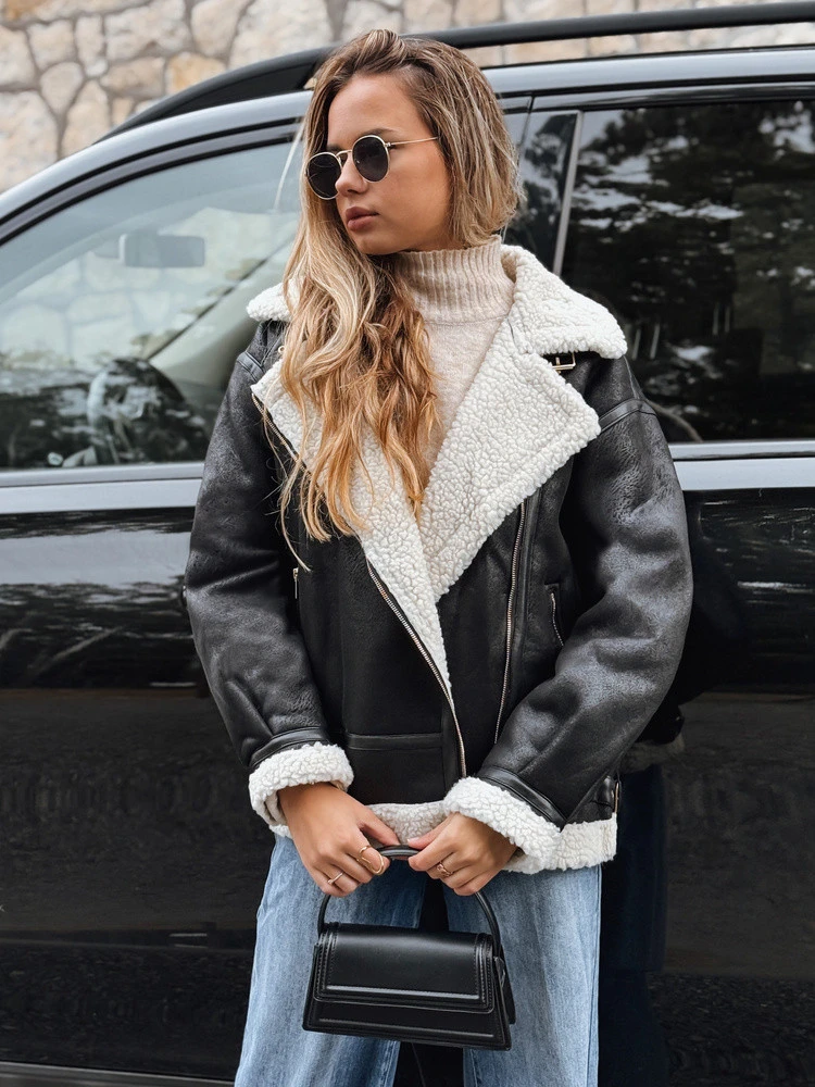 Model zachowuje charakter ramoneski, jednocześnie oferując ciepło dzięki wewnętrznemu kożuchowi. Kołnierz oraz mankiety obszyte tym samym materiałem dodają całości wyrazistego wyglądu. Dzięki prostemu krojowi kurtka sprawdzi się zarówno w zestawieniach codziennych, jak i bardziej wyrazistych stylizacjach, nadając im rockowego charakteru.