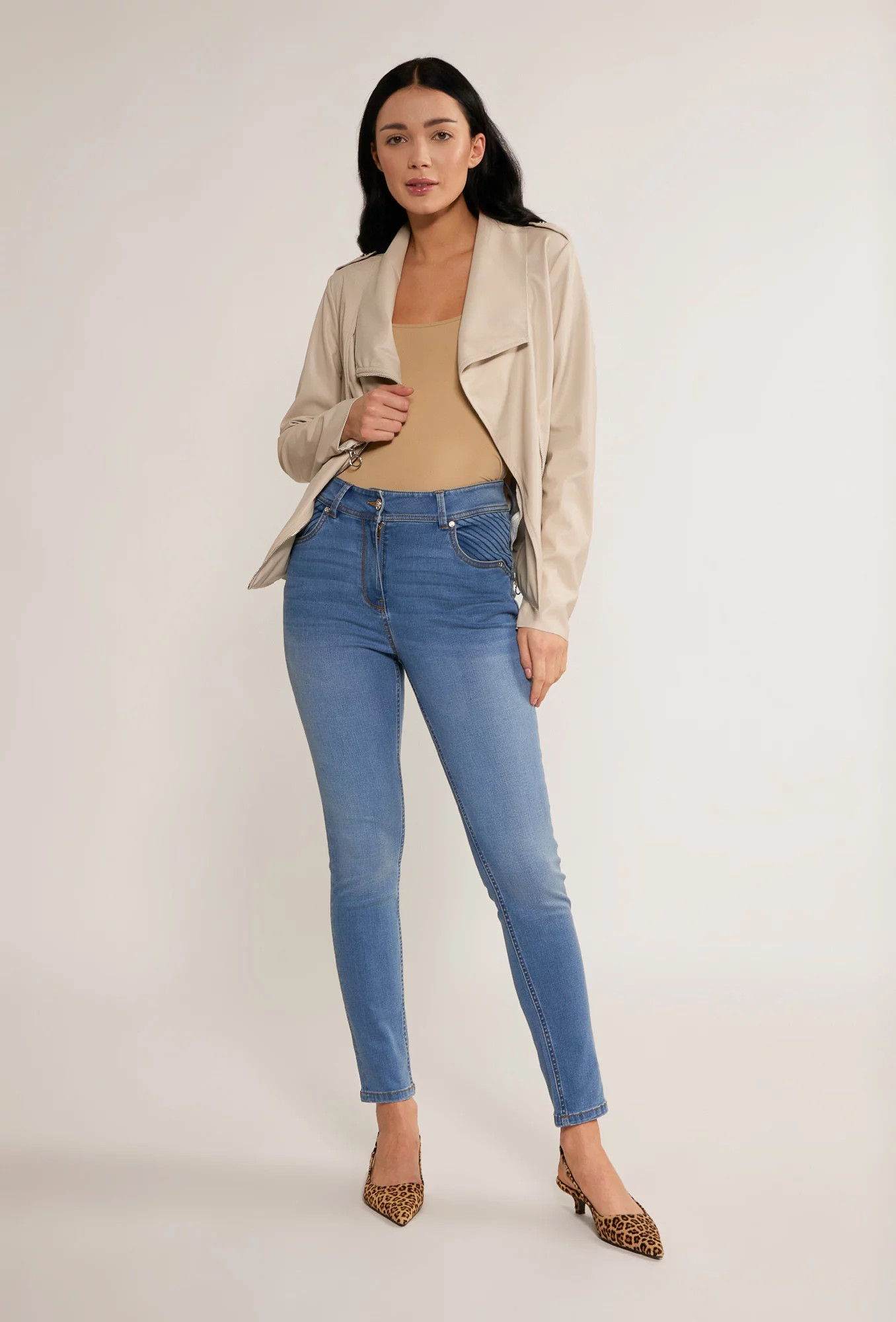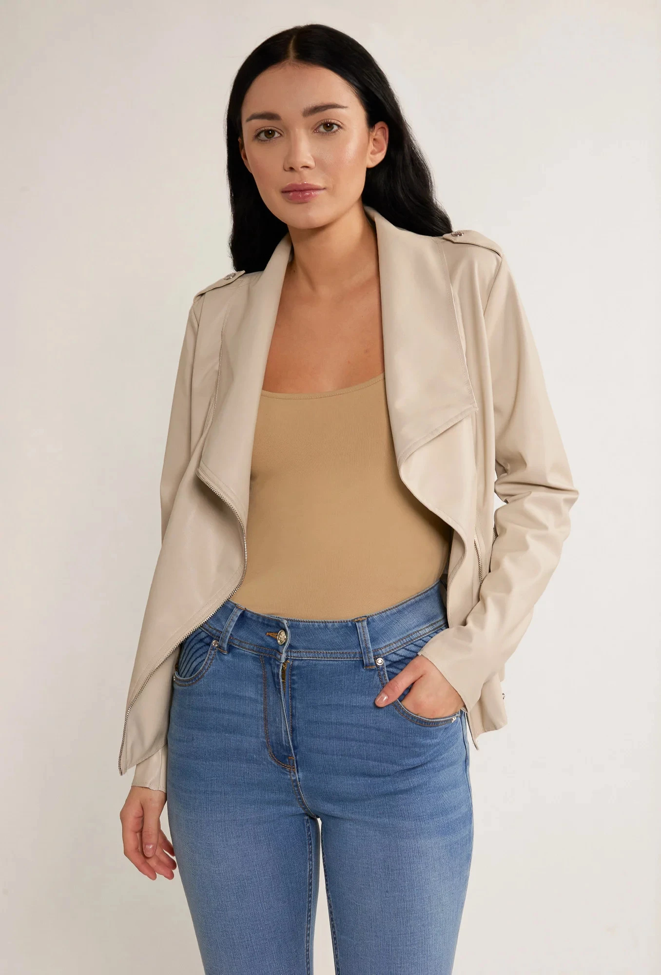 Dámská bunda typu ramonesque z měkké eko kůže. Bunda s dlouhými rukávy, velkým límcem a kapsami se zapínáním na zip. Bunda se zapíná na zip. Ramonesque je povinná výbava, která by neměla chybět v žádném šatníku. Modelka na obrázku je 177 cm vysoká a má velikost 36.