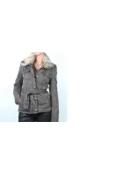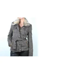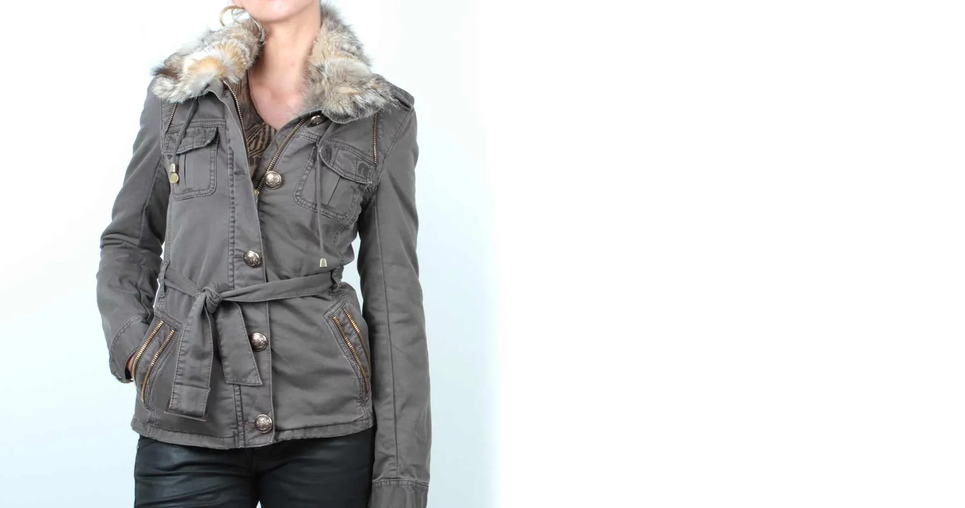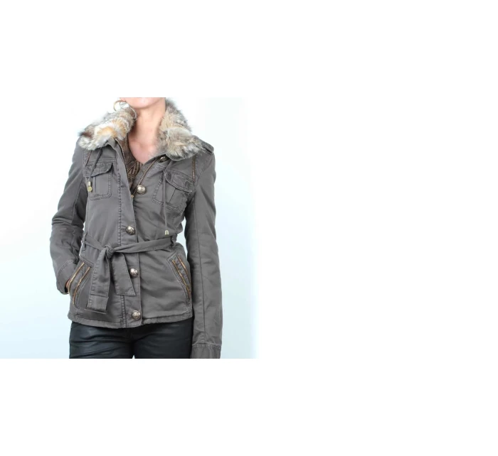 Elegantní dámská bunda khaki barvy s kapsami, přední klopou, kapsy na zip a ozdobné ramena, s kožešinovým límcem. Materiál: 100% bavlna