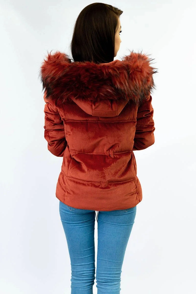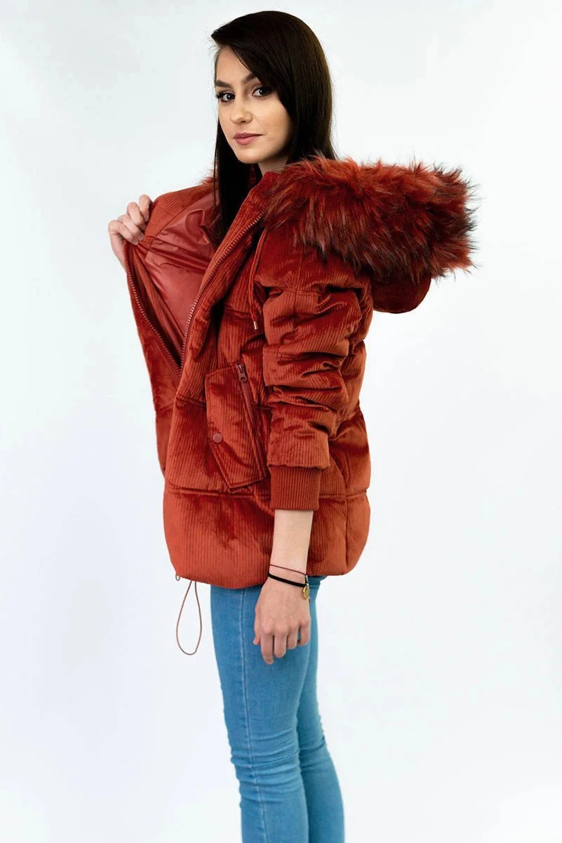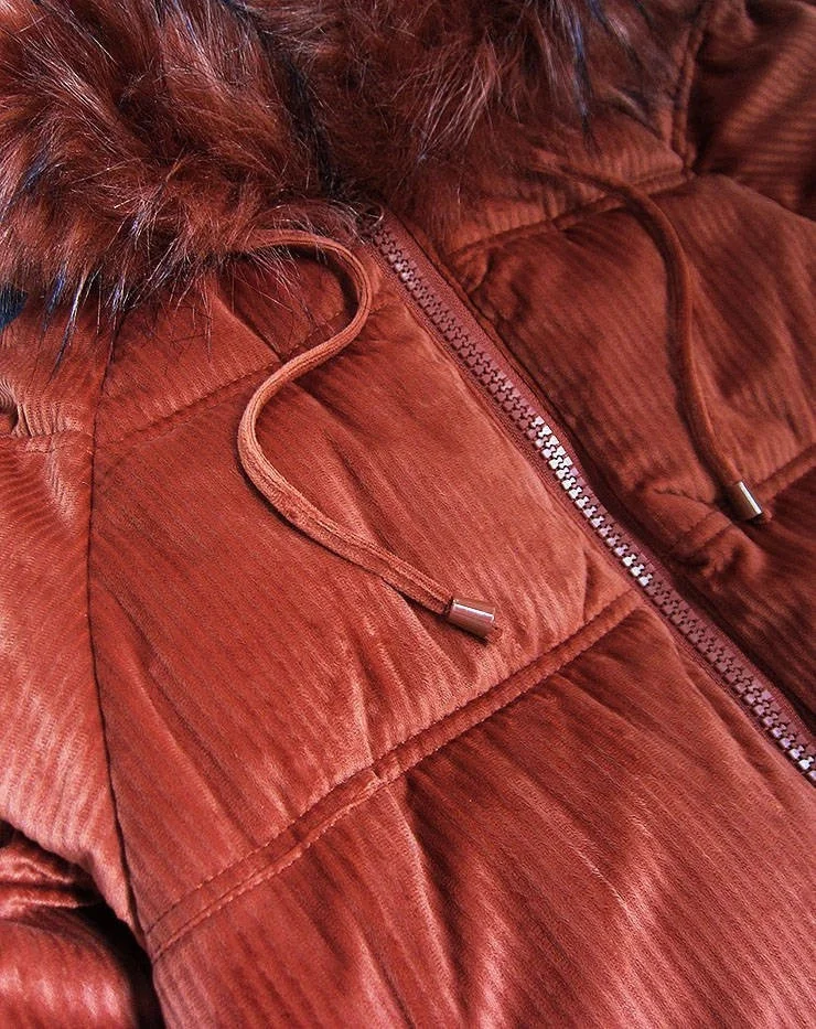 Bunda je vyrobená z materiálu imitujícího manšestr, má podšívku, je zateplená syntetickou péřovou výplní a má dvě kapsy. Model má stojáček, který přechází do kapuce olemované kožešinou. Zatímco kapuci není možné odepnout, kožešinu lemující kapuci odepnout lze. Na koncích rukávů jsou stahovací lemy. Na spodním okraji modelu jsou stahující šňůrky.