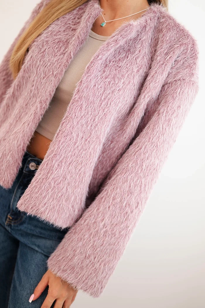 Dámská bunda s kožešinou bez zapínání tmavě růžová