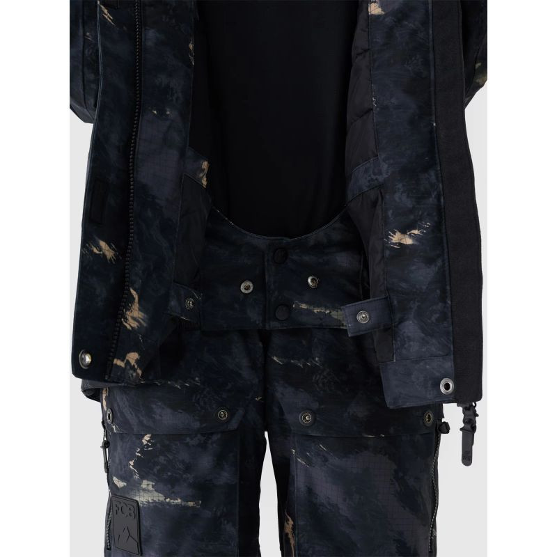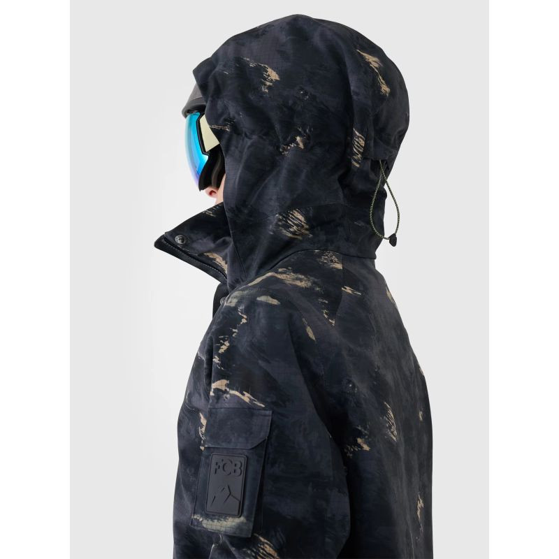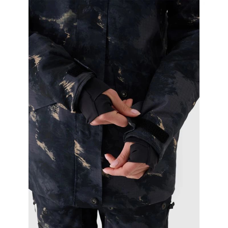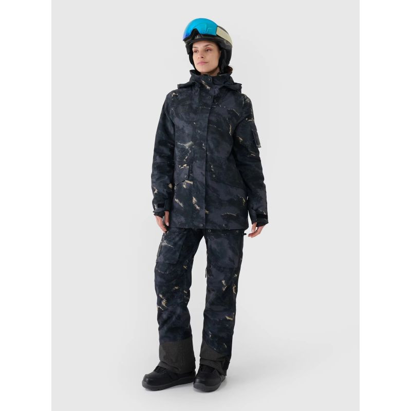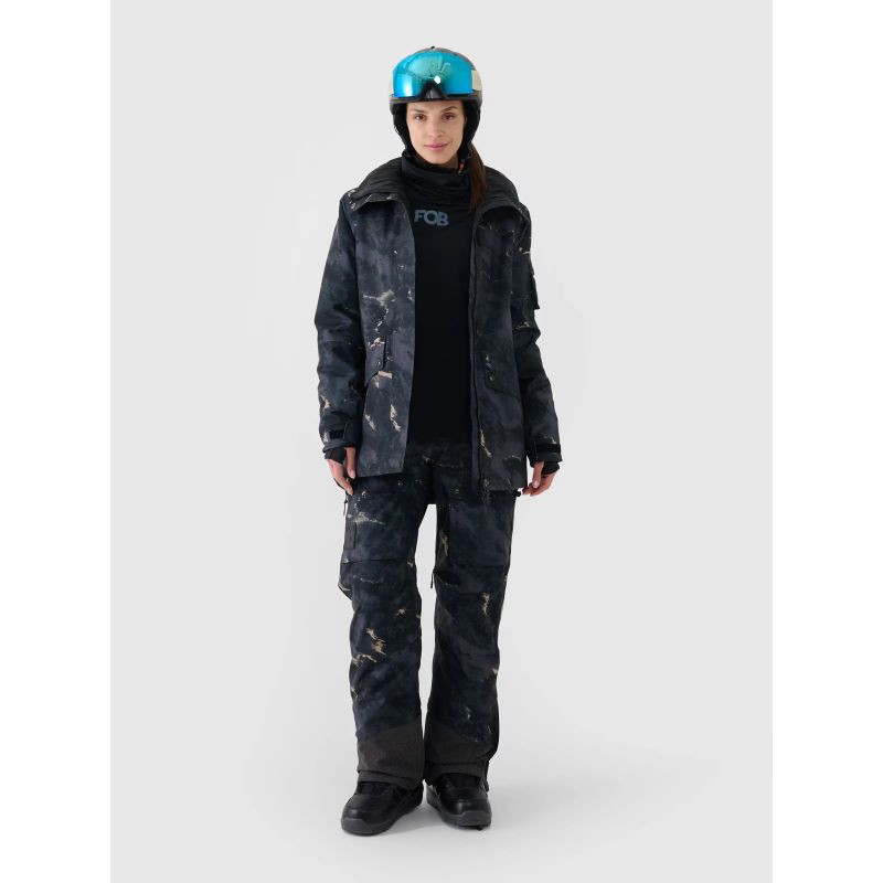 Damska kurtka snowboardowa z membraną jest wyposażona w zintegrowany kaptur z profilowanym daszkiem oraz regulacją objętości i głębokości. Szyję osłania wysoki kołnierz ocieplony miękkim trykotem, który dodatkowo zabezpieczy przed chłodem i wiatrem. Rękawy zakończone są mankietami z regulacją na rzep. Przedłużone wewnętrzne elastyczne mankiety z otworami na kciuki osłonią nadgarstki i dłonie przed zimnym wiatrem. Pod pachami umieszczono wentylację zapinaną na jednokierunkowy zamek kryty pod plisą, który daje możliwość regulacji przepływu powietrza. Po bokach znajdują się 2 kieszenie zapinane na zamek. Natomiast w środku znajduje się otwarta kieszeń na gogle, która wykonana jest z elastycznej siateczki. Co więcej, wewnętrzna kieszeń z zamkiem pozwoli na bezpieczny transport cennych przedmiotów, np. telefonu. Na lewym ramieniu jest niewielka kieszonka z zapięciem na rzep oraz kieszonka ski pass z zapięciem na zamek, która pomieści karnet narciarski lub inne drobiazg