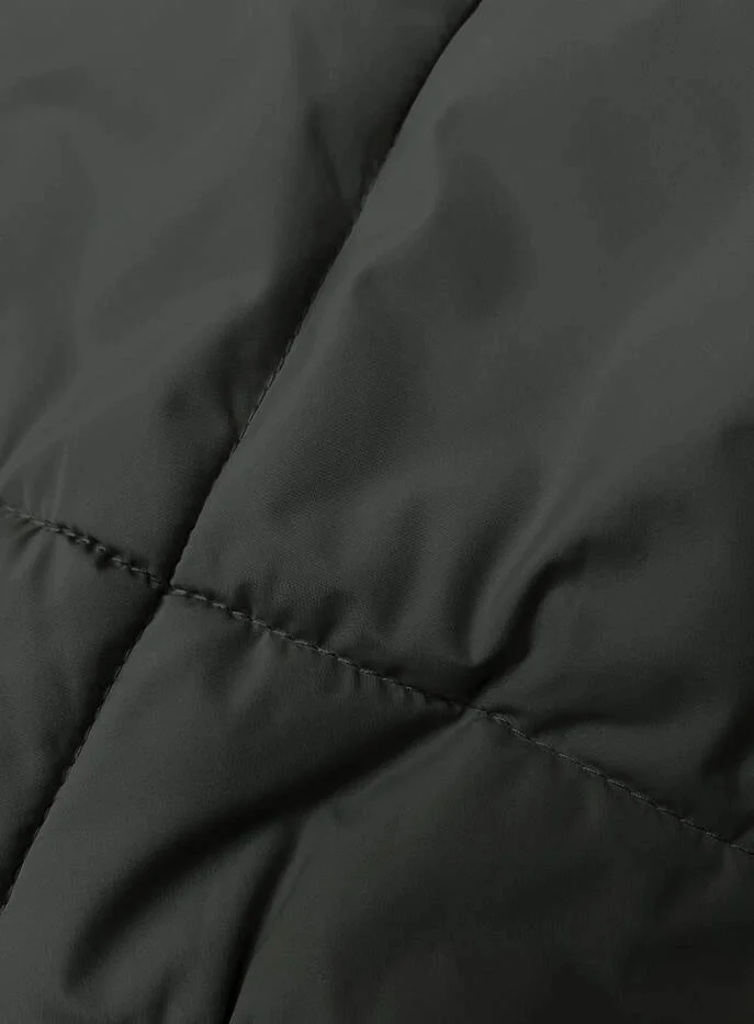 Bunda má volný střih, je zateplená vrstvou syntetické péřové výplně, má dvě kapsy bez zapínání a zapíná se šikmým zipem a panelem s patentkami. Na koncích rukávů jsou skryté stahovací lemy. Model má délku k bokům.