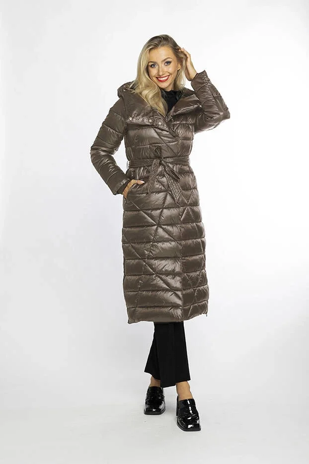 Bunda je lehce vypasovaná, je zateplená vrstvou syntetické péřové výplně, má dvě kapsy a zapíná se šikmým zipem. Model má kapuci, kterou není možné odepnout. Bunda má délku ke kolenům.