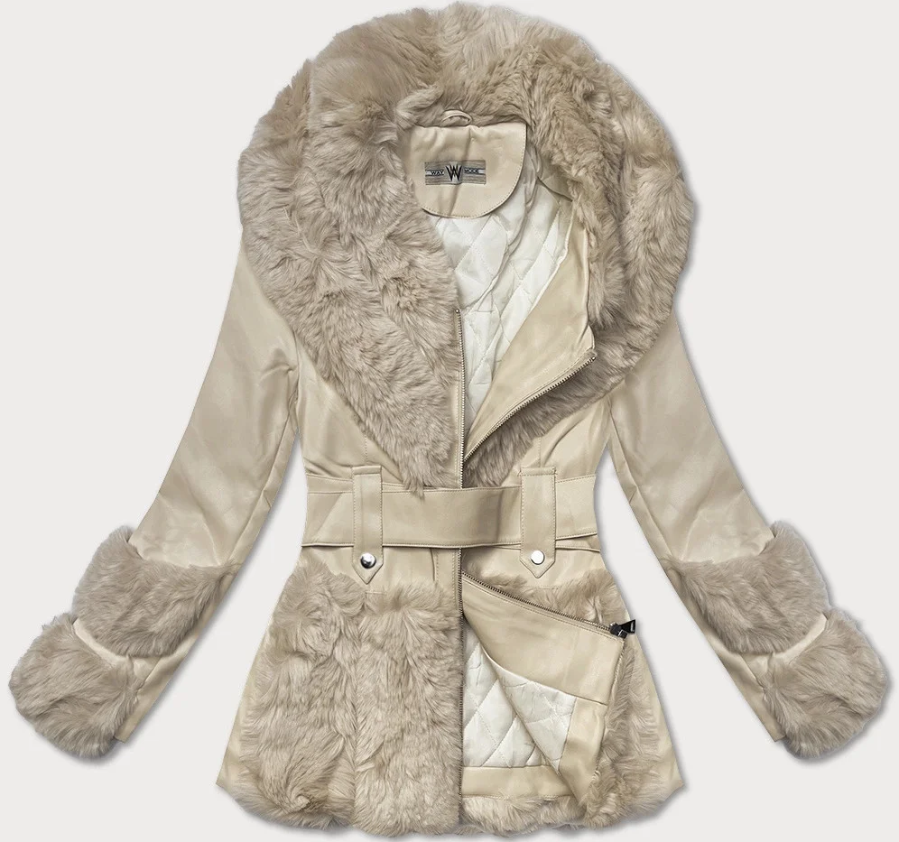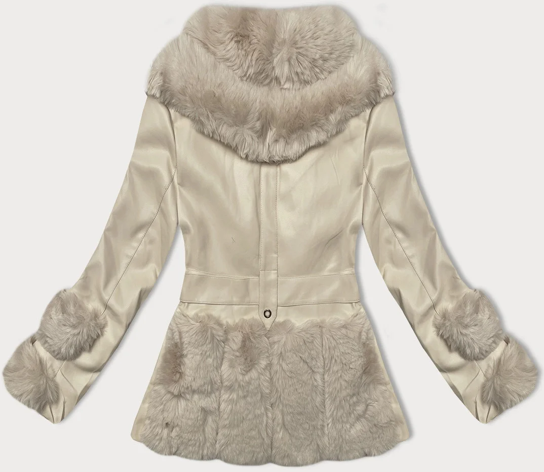 Dámská bunda z eko kůže v barvě ecru s kožešinovým límcem Way Mode (OMS-15WD-03)