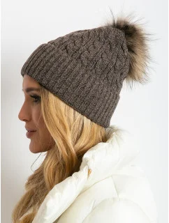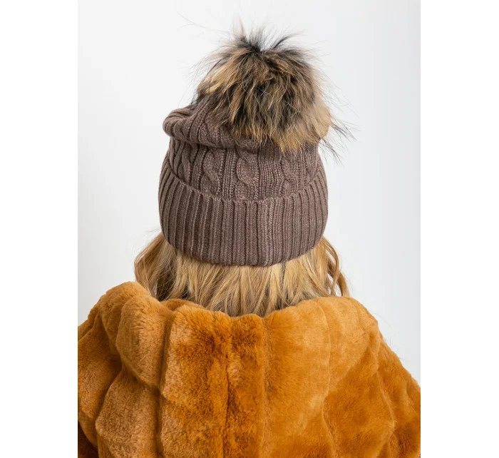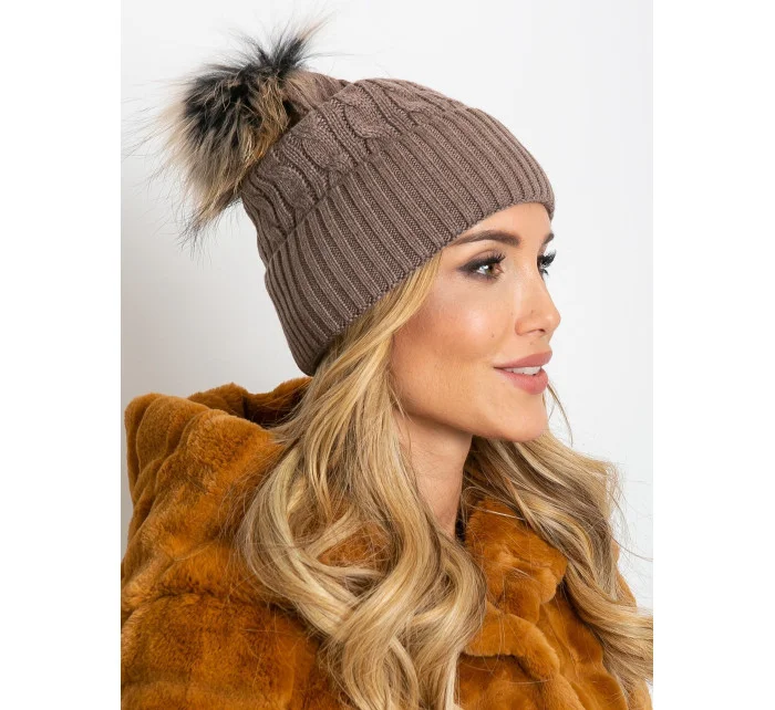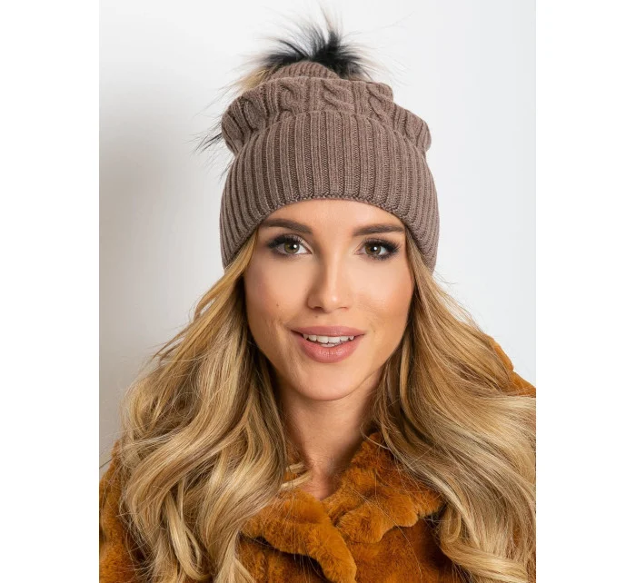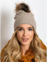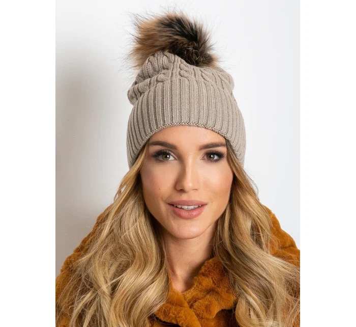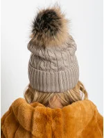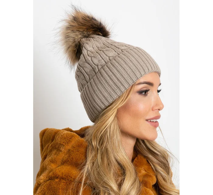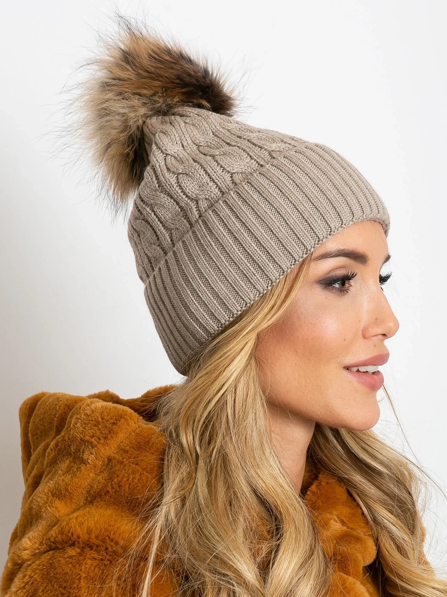 Béžová čepice s kostkovaným vzorem a kožešinovou bambulí