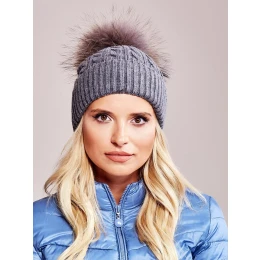 Čepice s kostkovaným vzorem a chlupatou bambulí tmavě šedá