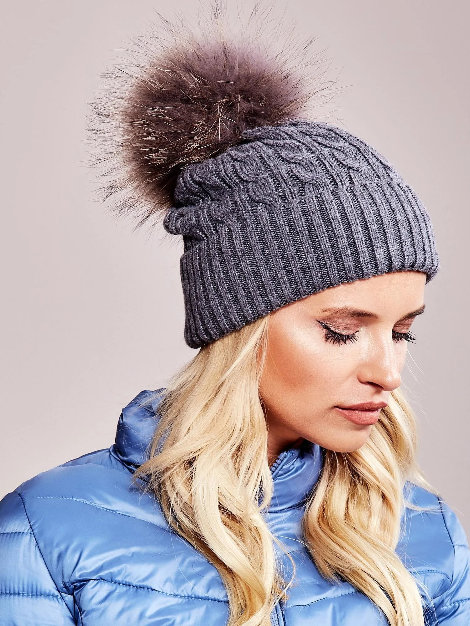 Čepice s kostkovaným vzorem a chlupatou bambulí tmavě šedá