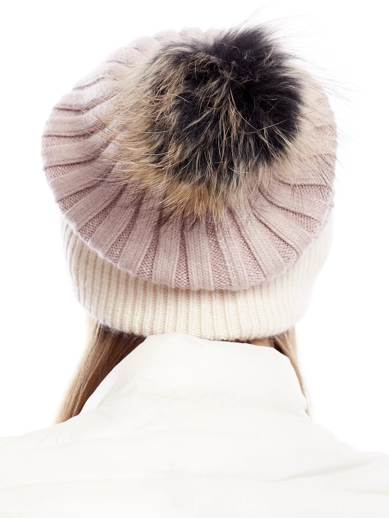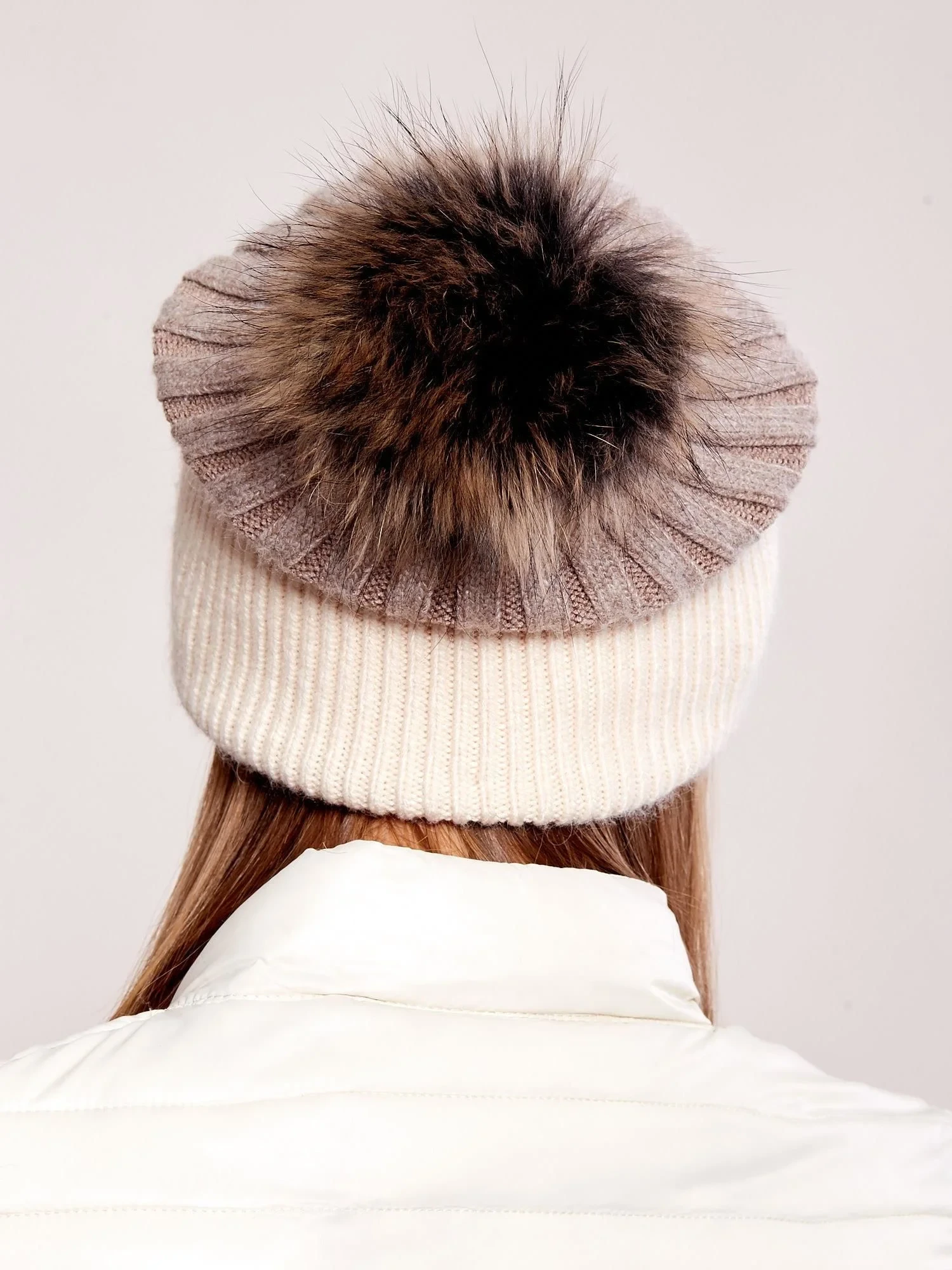 Žebrovaná čepice s chlupatou bambulí světle hnědá