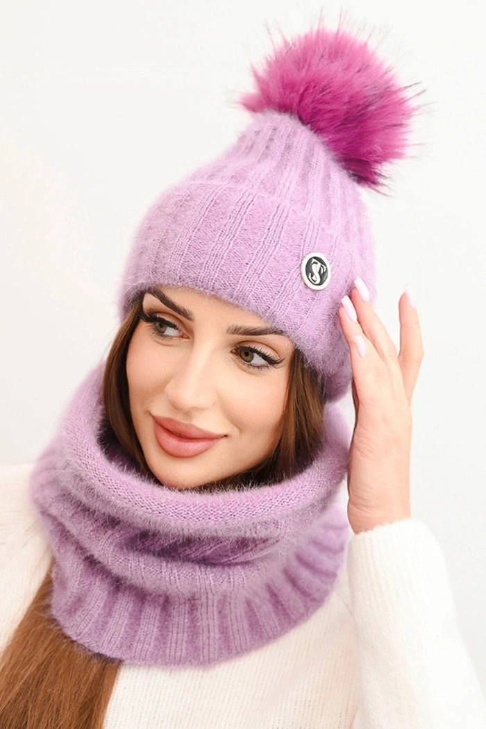 Stylový a praktický zimní set pro ženy – čepice s efektním velkým pomponem a měkký nákrčník. Vyrobeno z příjemného na dotek, nadýchaného úpletu s jemným leskem. Zajišťuje tepelný komfort a módní vzhled v chladných dnech.