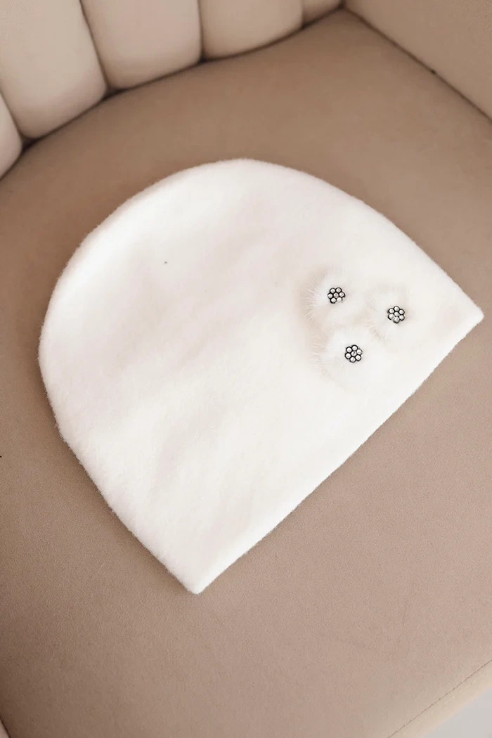 Dámská čepice s ozdobnými chlupatými květy elegantní bílá