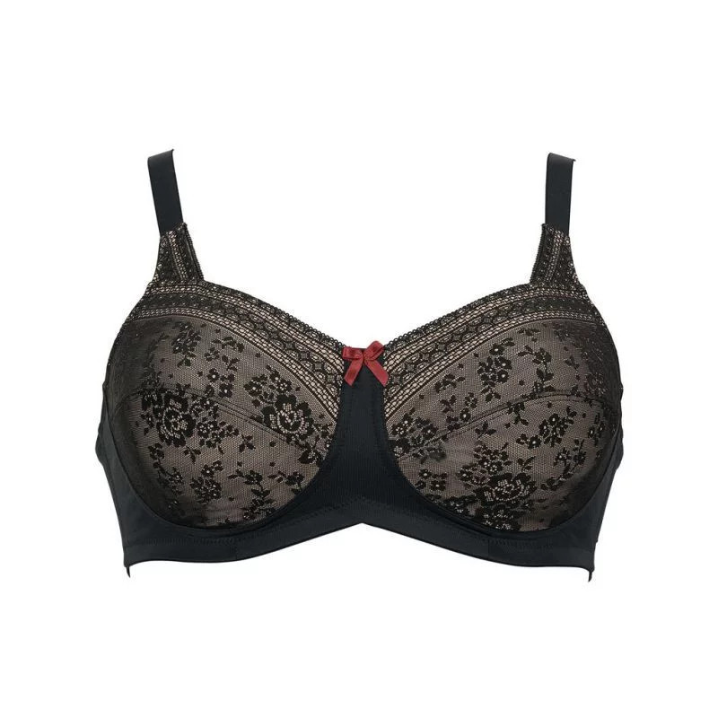 Podprsenka pro ženy po masektomii, ušitá ze sexy grafitové krajky na světle růžové podšívce. Kombinace krajky a látky vytváří dojem průhledné, svůdné podprsenky se vzdušnou, lehkou konstrukcí. Stabilní oporu prsou i protézy zajišťuje speciální konstrukce a výztuhy, které jsou tak důležité v případě větších velikostí. Jemné pásky a lemy zajišťují nejvyšší pohodlí při nošení. Ideální pro dámy, které se chtějí cítit žensky a přitažlivě.