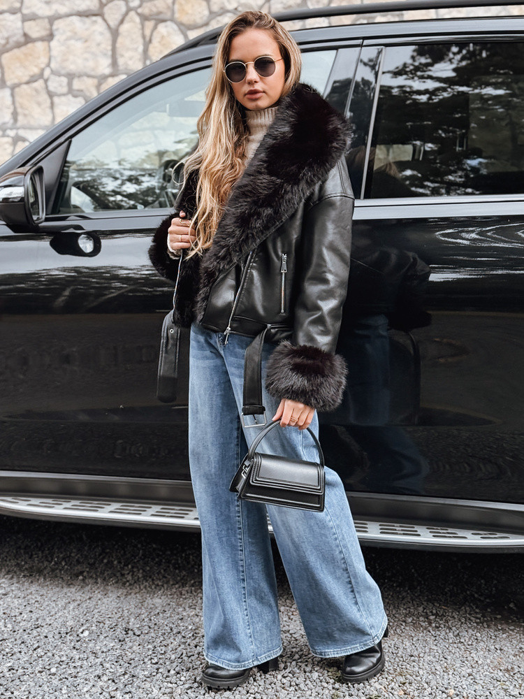 Černá bunda Ramonesque má jedinečný charakter díky kožešinovému lemování na límci a rukávech. Díky kožešinové podšívce uvnitř je bunda vhodná i v chladnějších dnech, přičemž zůstává lehká a pohodlná. Zapínání na zip v kombinaci s páskem v pase dodává bundě rockerský styl a je skvělou volbou pro ležérní i ostré outfity.