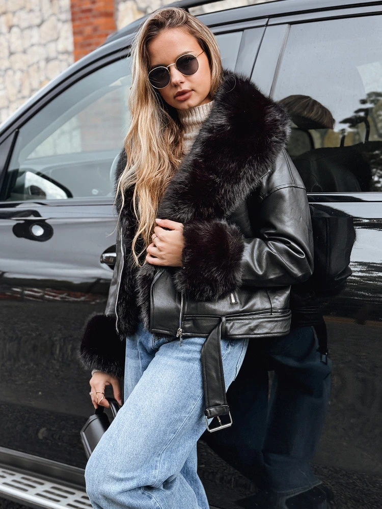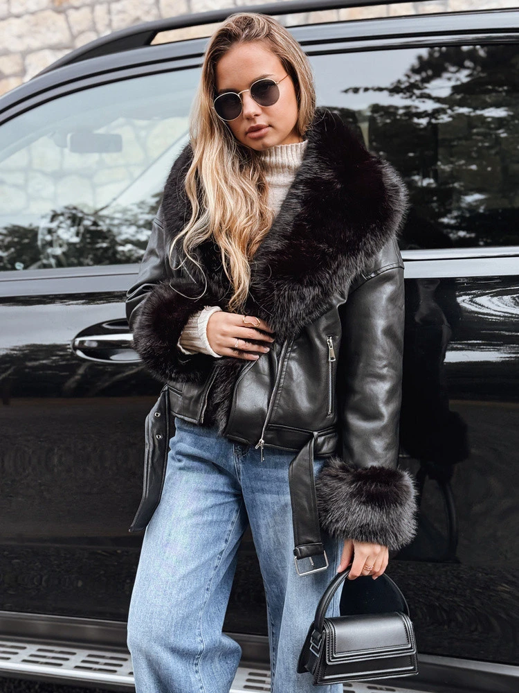 Dámská bunda ramon z měkké ekologické kůže je kombinací klasického střihu a funkčního zateplení. Model na zip a pásek v pase zdůrazňují siluetu, zatímco kožešina uvnitř zajišťuje tepelný komfort. Odnímatelné kožešinové prvky na límci a rukávech umožňují přizpůsobit vzhled příležitosti a počasí.