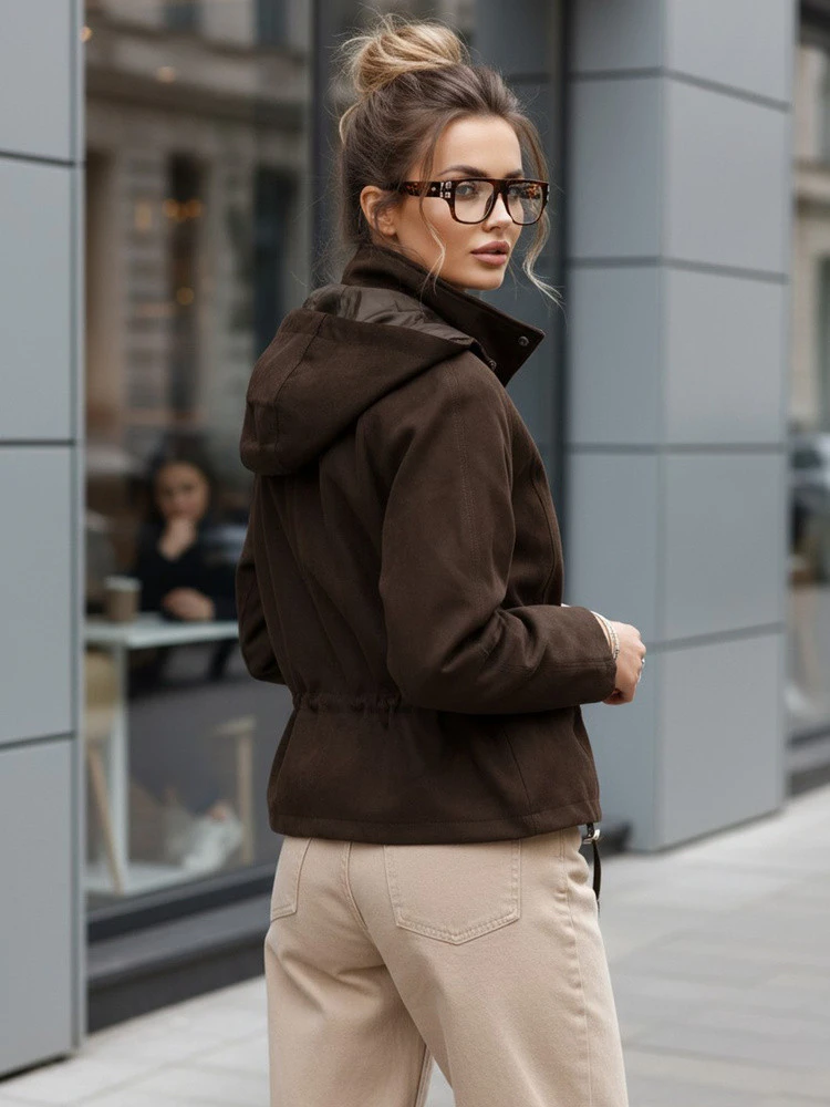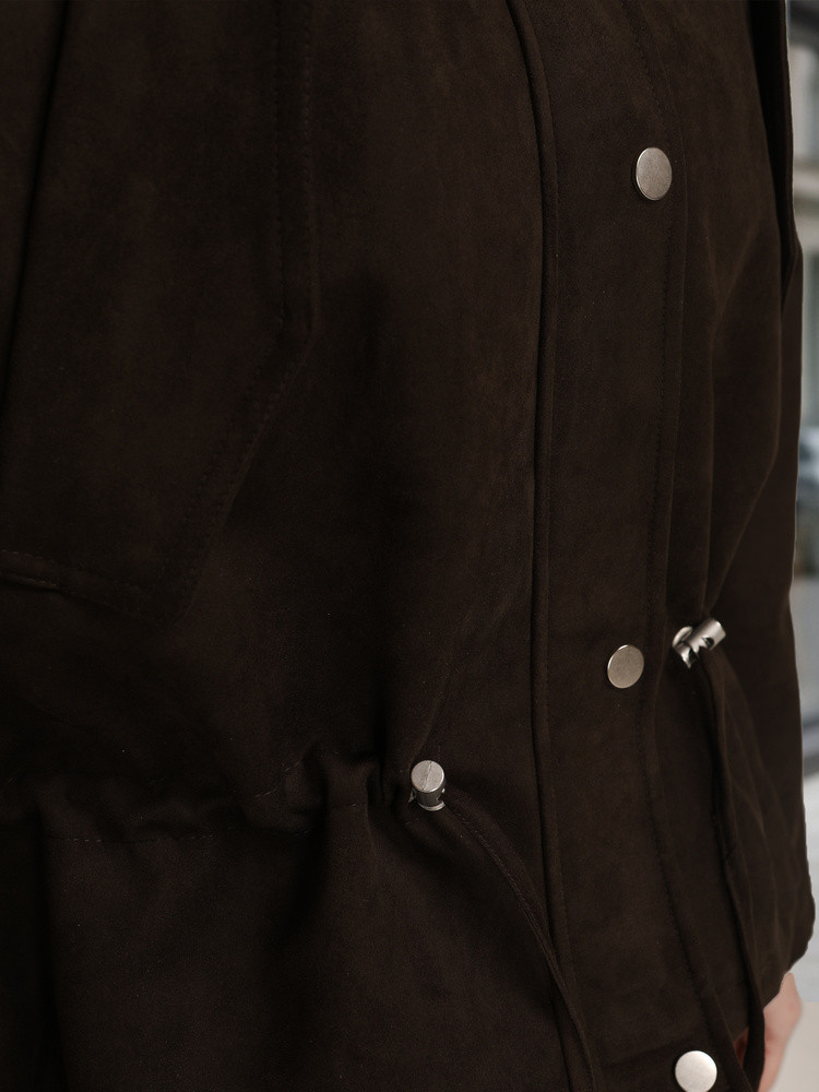 Tato semišová bunda s krátkou délkou, která je nezbytným doplňkem této sezóny, usnadňuje budování každodenního vzhledu a dobře sedí na postavě. Kapuce vás ochrání před větrem a regulace v pase vám umožní přizpůsobit střih podle vašich preferencí. Zapínání na zip a patentky stabilizuje přední část a pomáhá udržet teplo. Bunda je vyrobena z materiálu imitujícího semiš.