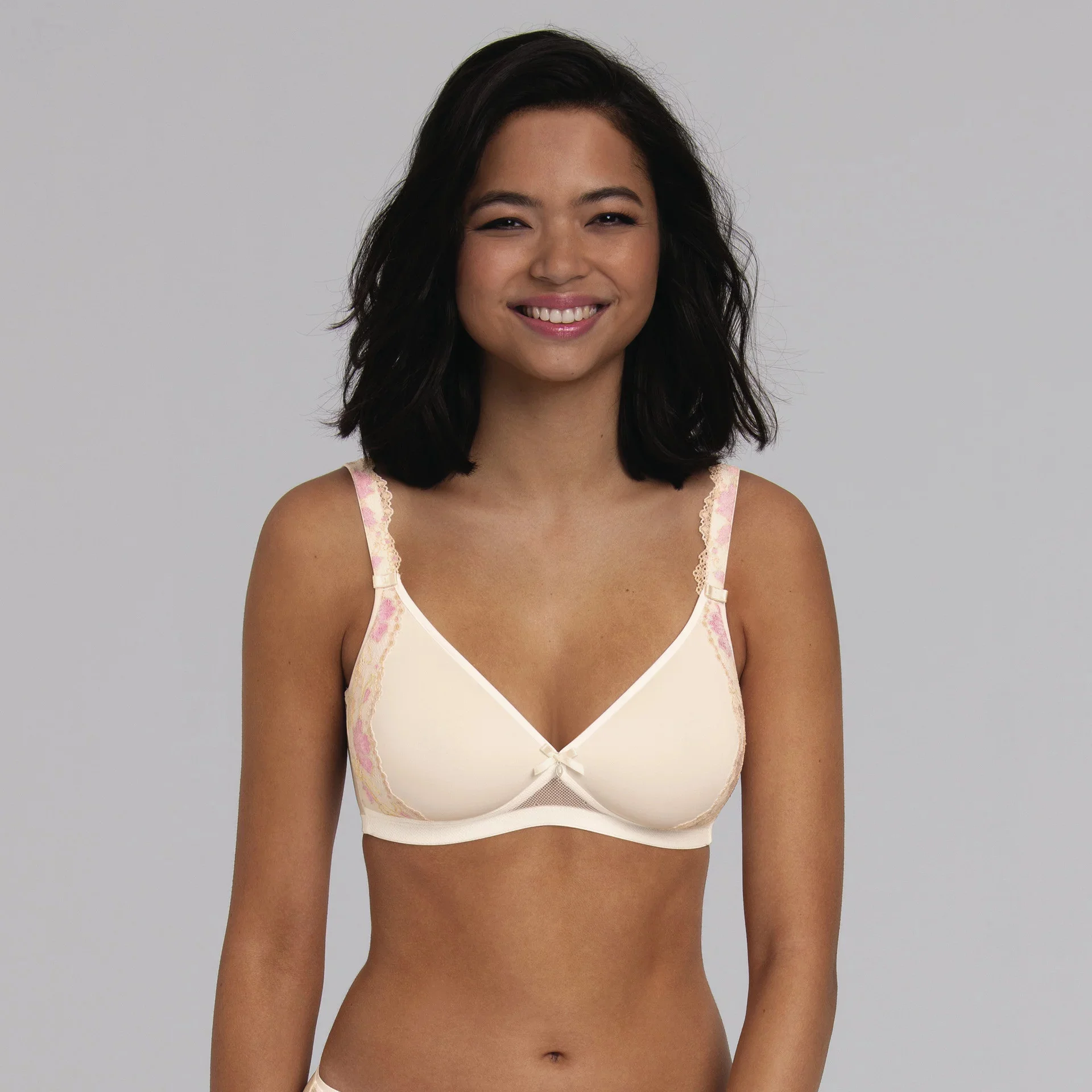 Vive la femme! Trojúhelníková podprsenka bez kostic ze série Colette má hluboký výstřih pro extra sexy vzhled. Soft podprsenka je dodávána s prodyšnými vymezovacími košíčky a navazuje na charakteristický trikolorní motiv květinové krajky. Zde se znovu objevuje úchvatná krajka v podobě půlměsícových vsadek na bocích košíčků a na ramínkách.
