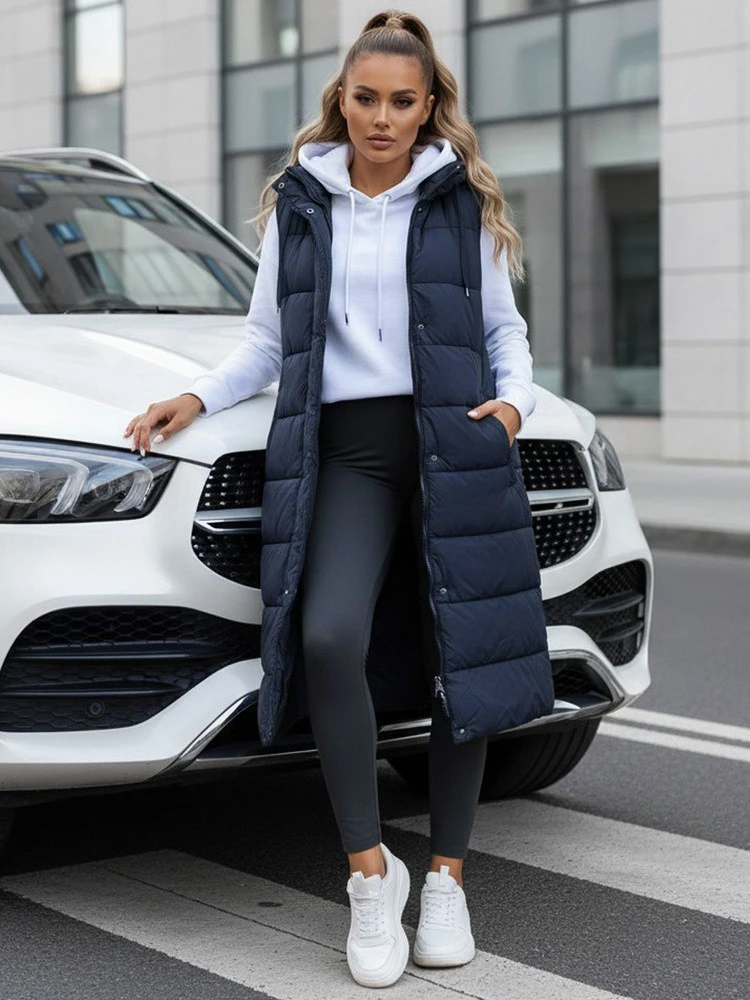 Dlouhá prošívaná vesta je praktickou a pohodlnou nabídkou pro přechodné období. Kvalitní materiál zaručuje pohodlí a ochranu před chladem. Kapuce dodává funkčnost a díky jednoduchému střihu se model hodí k mnoha outfitům. Skvěle doplní sportovní i každodenní komplety.