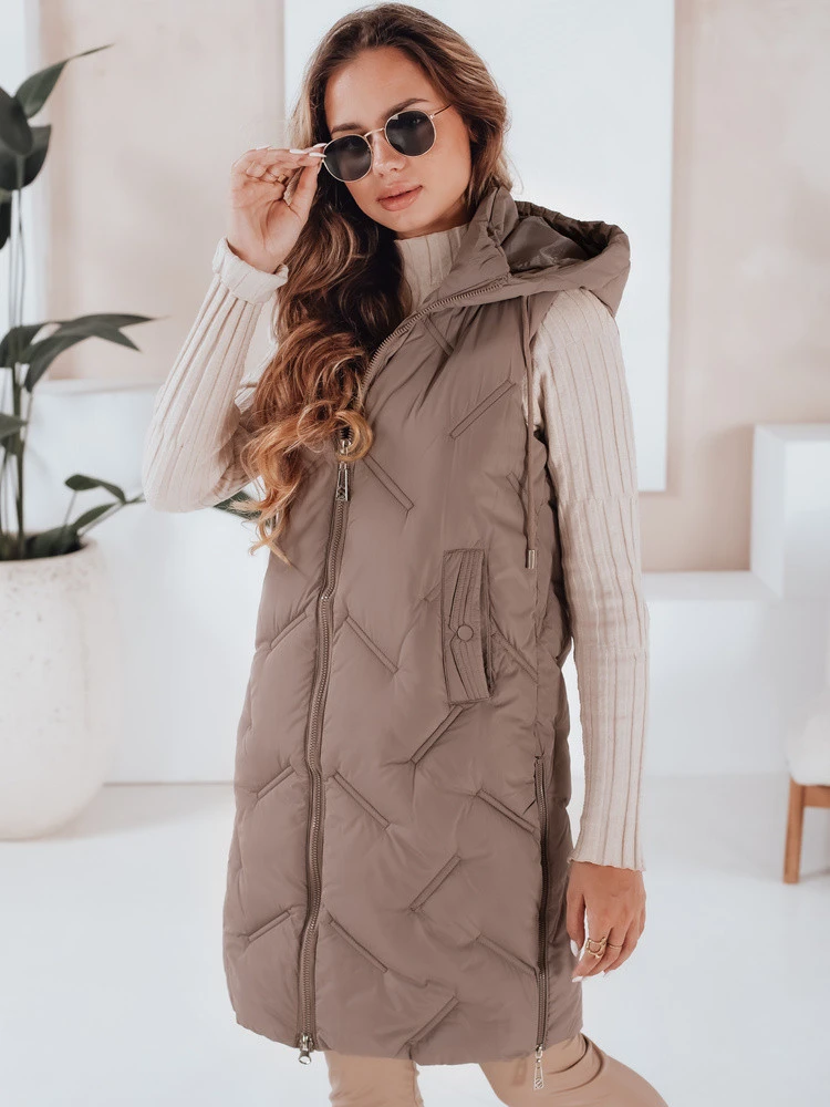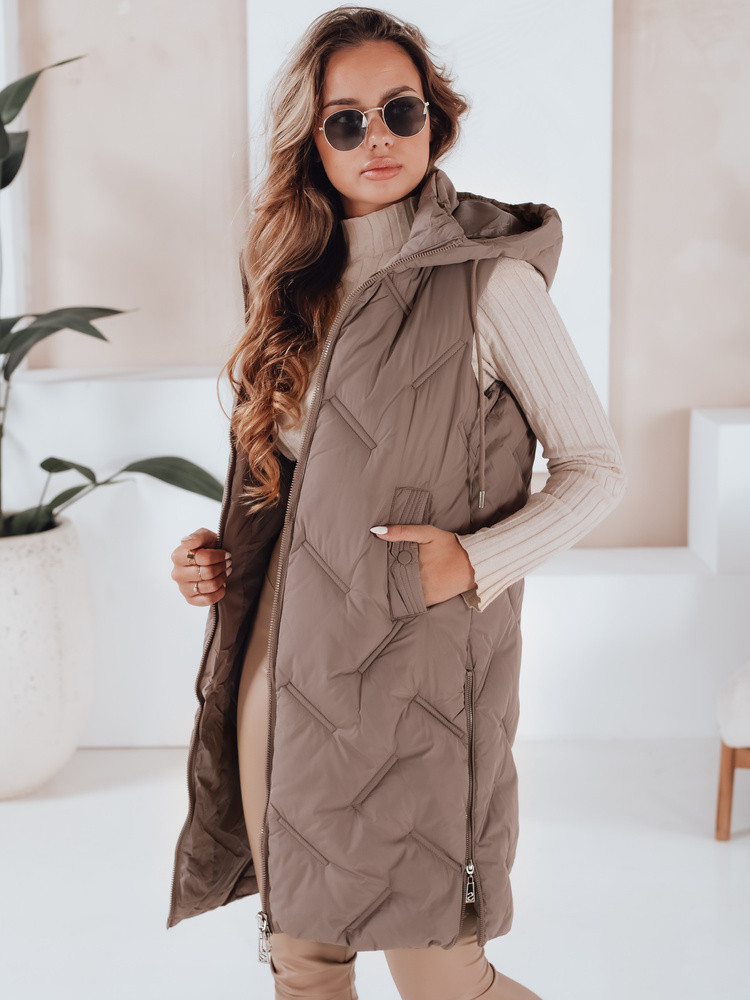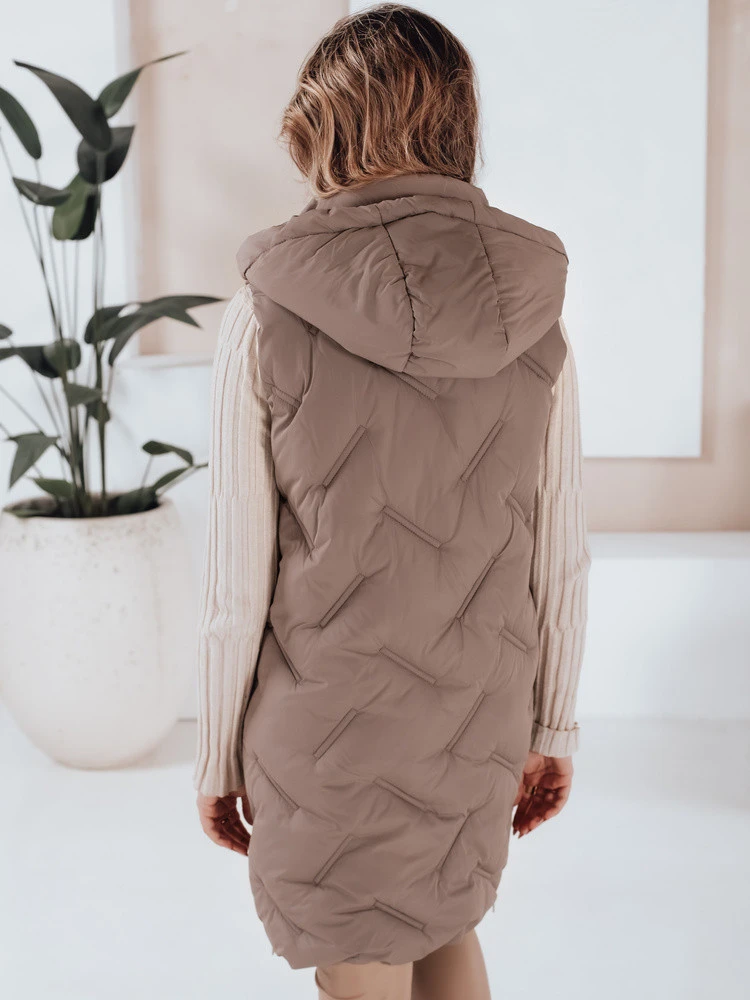 Dámská dlouhá prošívaná vesta s kapucí tmavě béžová FashionStreet TY5100