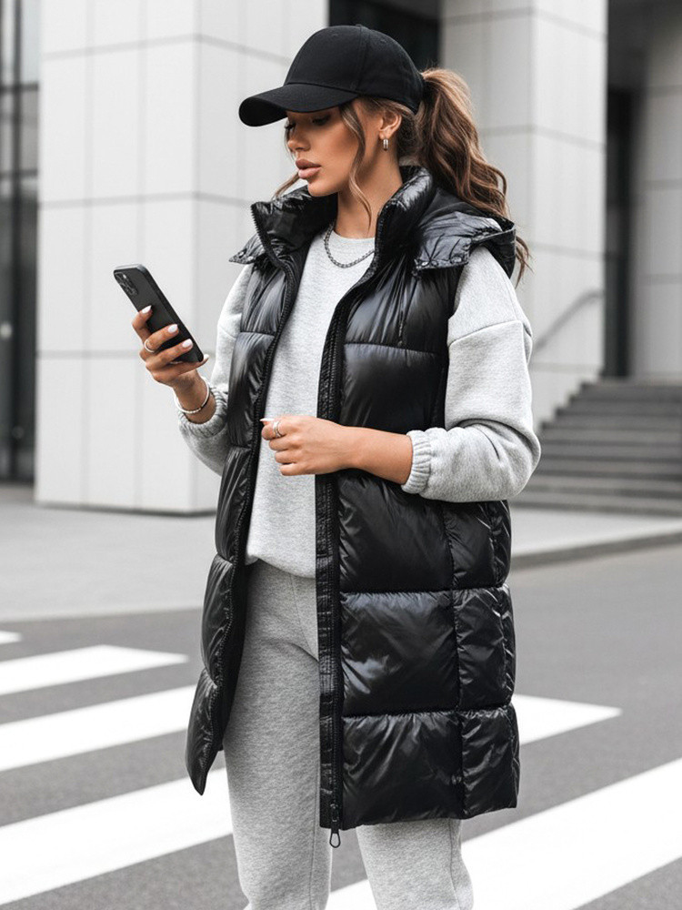 Prošívaná vesta s prodlouženým tvarem doplňuje styling v přechodném období a v chladnějších dnech. Lehká konstrukce poskytuje pohodlí, aniž by byla příliš těžká. Vysoký límec zvyšuje ochranu před větrem a praktická kapuce zvyšuje funkčnost. Střih se dobře hodí pro každodenní nošení.