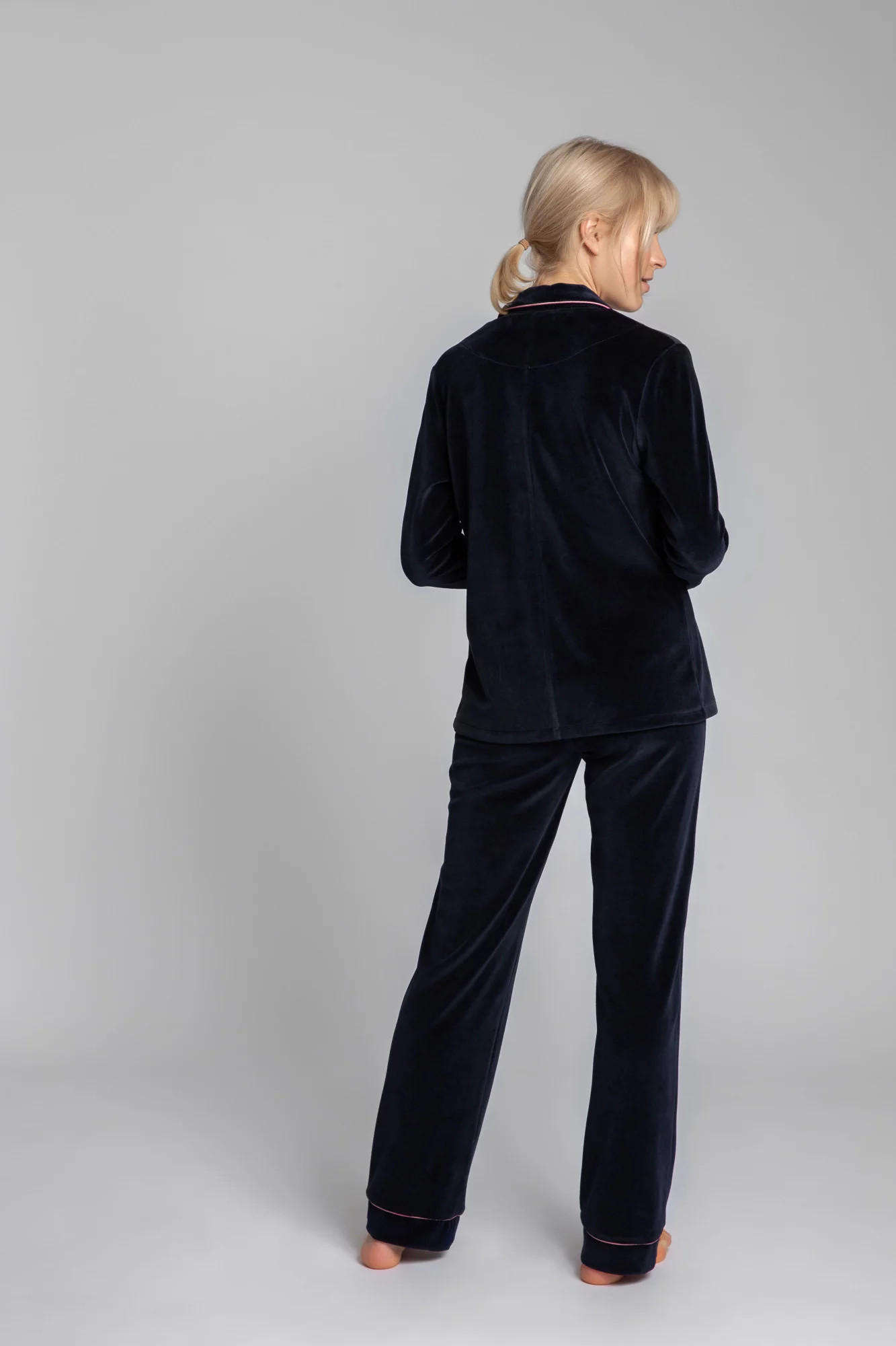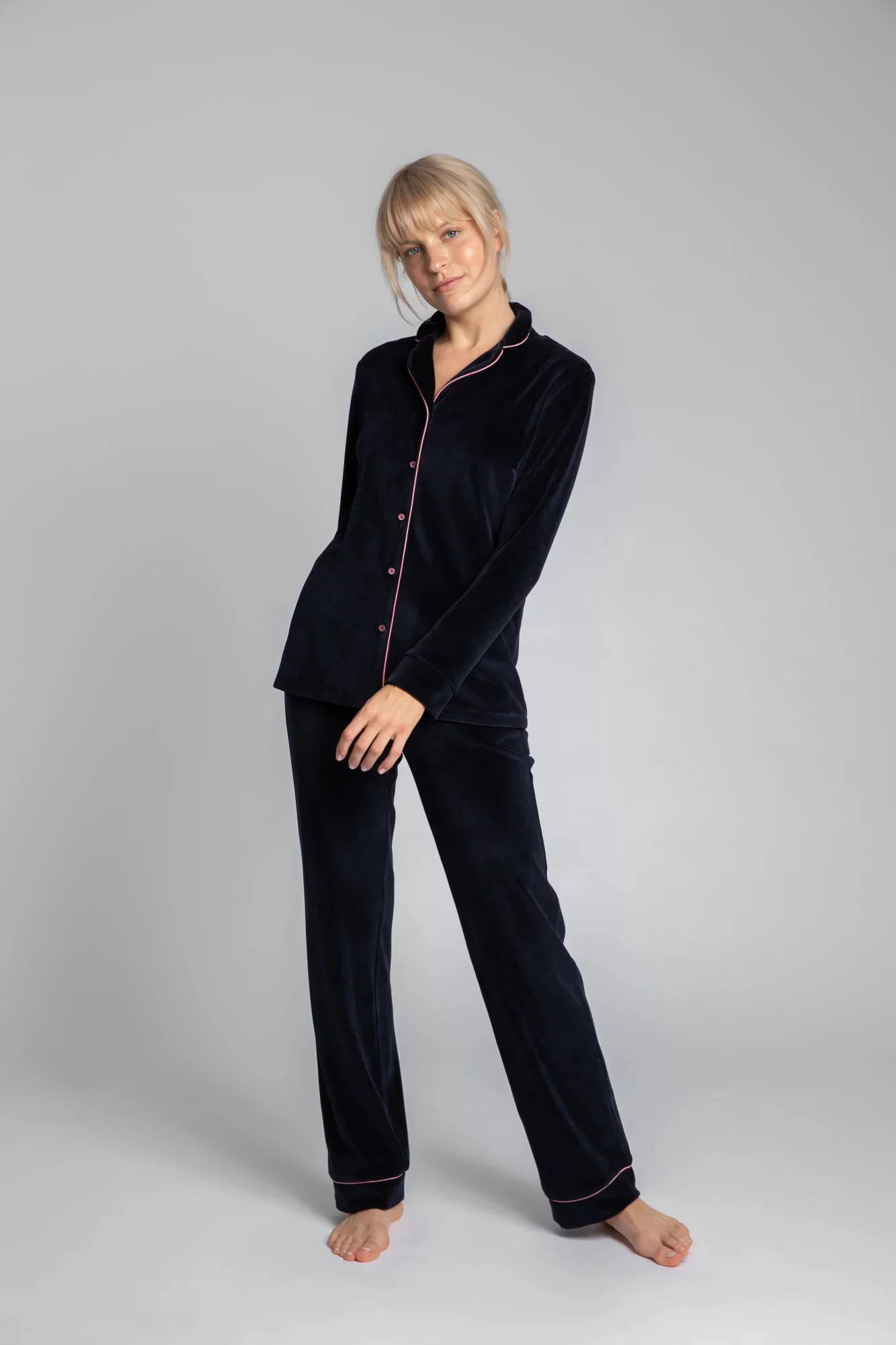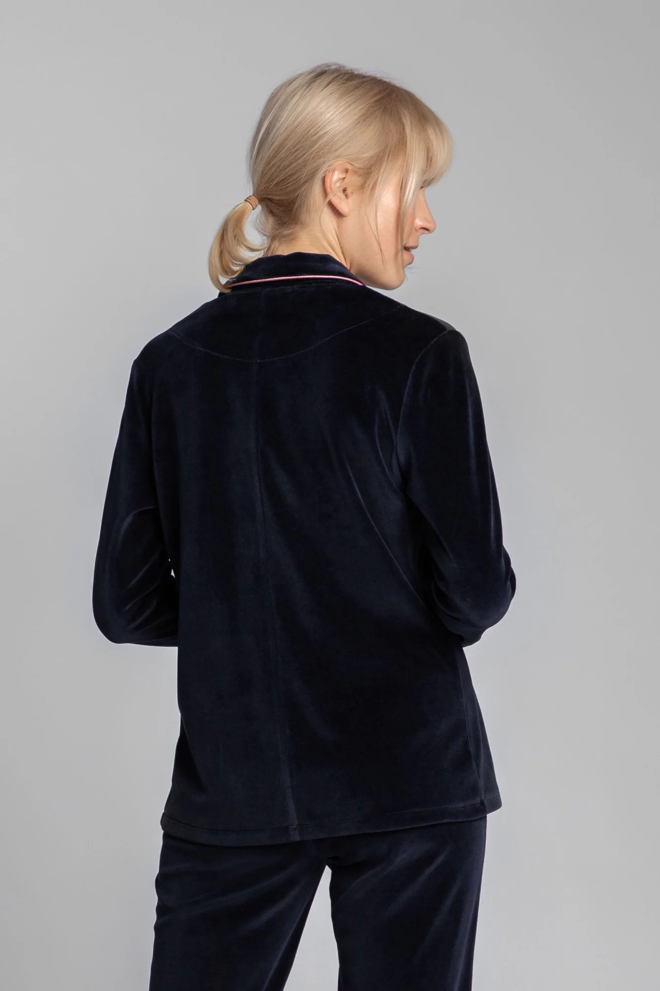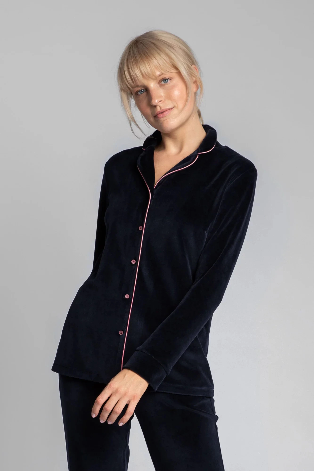Luxusní sametový pyžamový top s knoflíky, vroubkovaným límcem a ozdobným lemováním pro lepší vzhled. Košile se nejlépe doplňuje s našimi sametovými pyžamovými kalhotami s ozdobným lemováním.