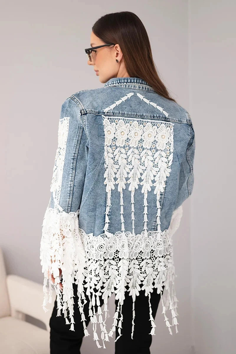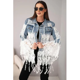 Tato výjimečná dámská jeansová bunda je ideální kombinací klasického denimu a ženského půvabu. Ozdobená širokými pruhy bílé krajky se vzorem, přitahuje pohledy a vyniká v každém outfitu. Bohatě zdobené rukávy a spodní část bundy dodávají celku romantický boho charakter. Jemné zakončení dodává lehkost a subtilnost.