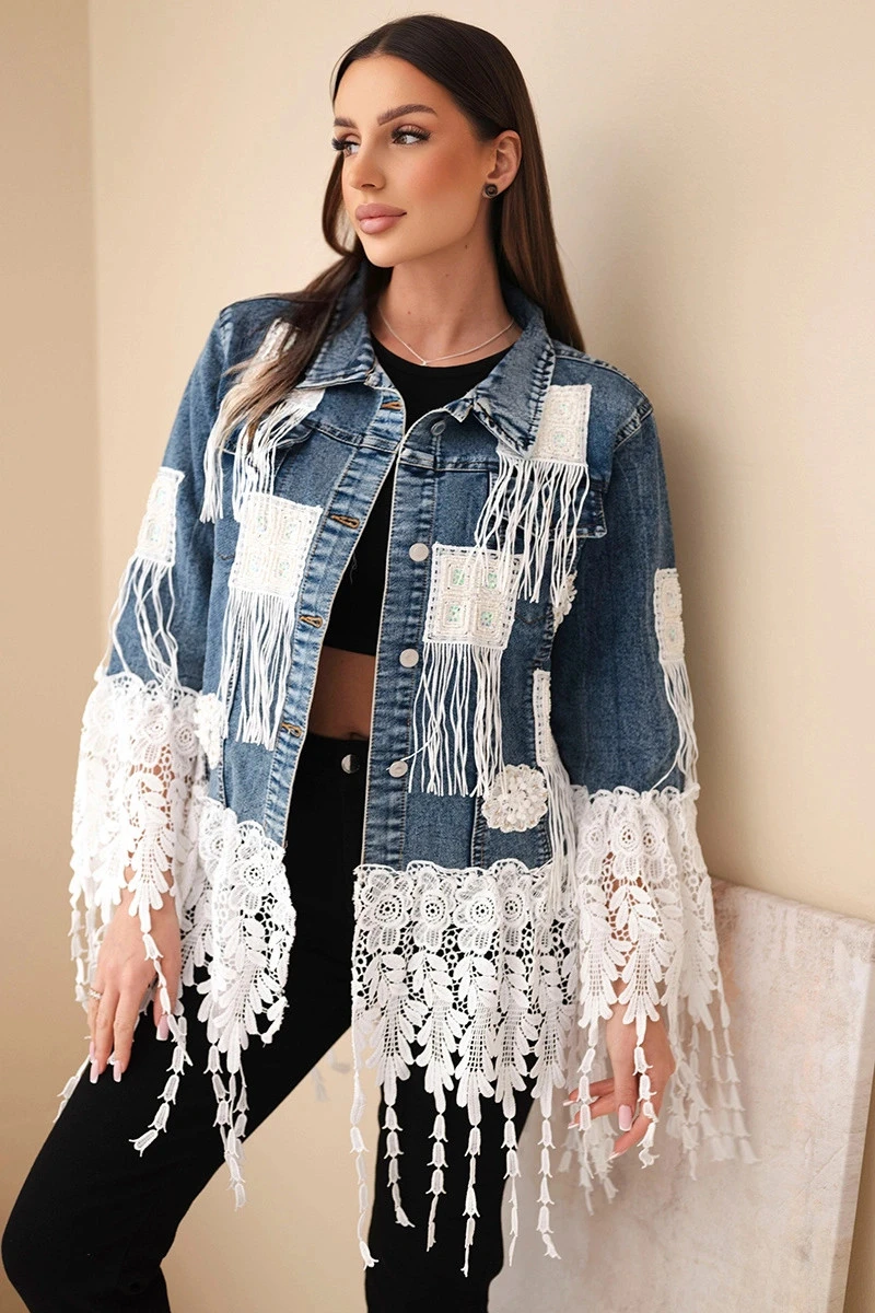 Tato jedinečná džínová bunda je skutečným klenotem v boho stylu! Ozdobená krajkovými vložkami, třásněmi a vyšívanými čtverci, přitahuje pozornost a dává každému outfitu unikátní charakter. Třásně a jemná krajka v dolní části bundy a na rukávech dodávají lehkost a ženské kouzlo, zatímco etno aplikace podtrhují umělecký styl celku.