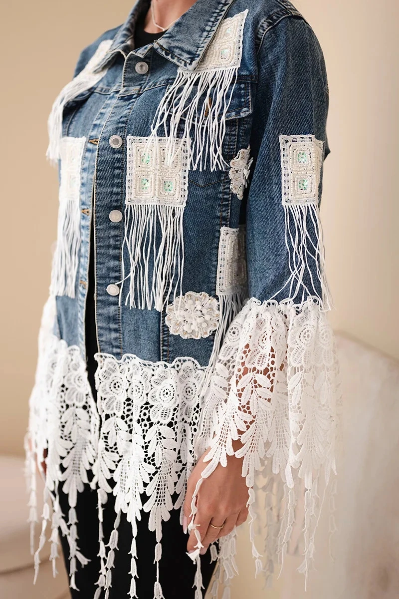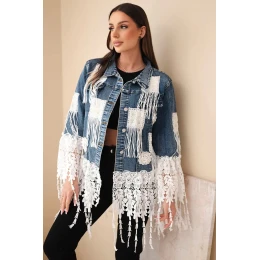 Tato jedinečná džínová bunda je skutečným klenotem v boho stylu! Ozdobená krajkovými vložkami, třásněmi a vyšívanými čtverci, přitahuje pozornost a dává každému outfitu unikátní charakter. Třásně a jemná krajka v dolní části bundy a na rukávech dodávají lehkost a ženské kouzlo, zatímco etno aplikace podtrhují umělecký styl celku.