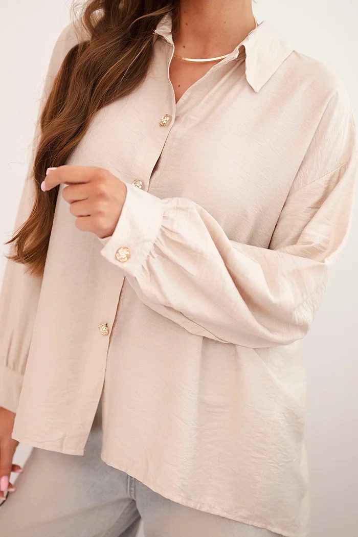Tato dámská elegantní košile z viskózy je návrh, který se ideálně hodí jak do práce, tak na výjimečné příležitosti. Vyrobena z příjemného, splývavého materiálu s jemným leskem, vypadá velmi stylově a žensky. Zlaté, ozdobné knoflíky dodávají celku šarm, a prodloužený zadní díl zajišťuje moderní a pohodlný střih.