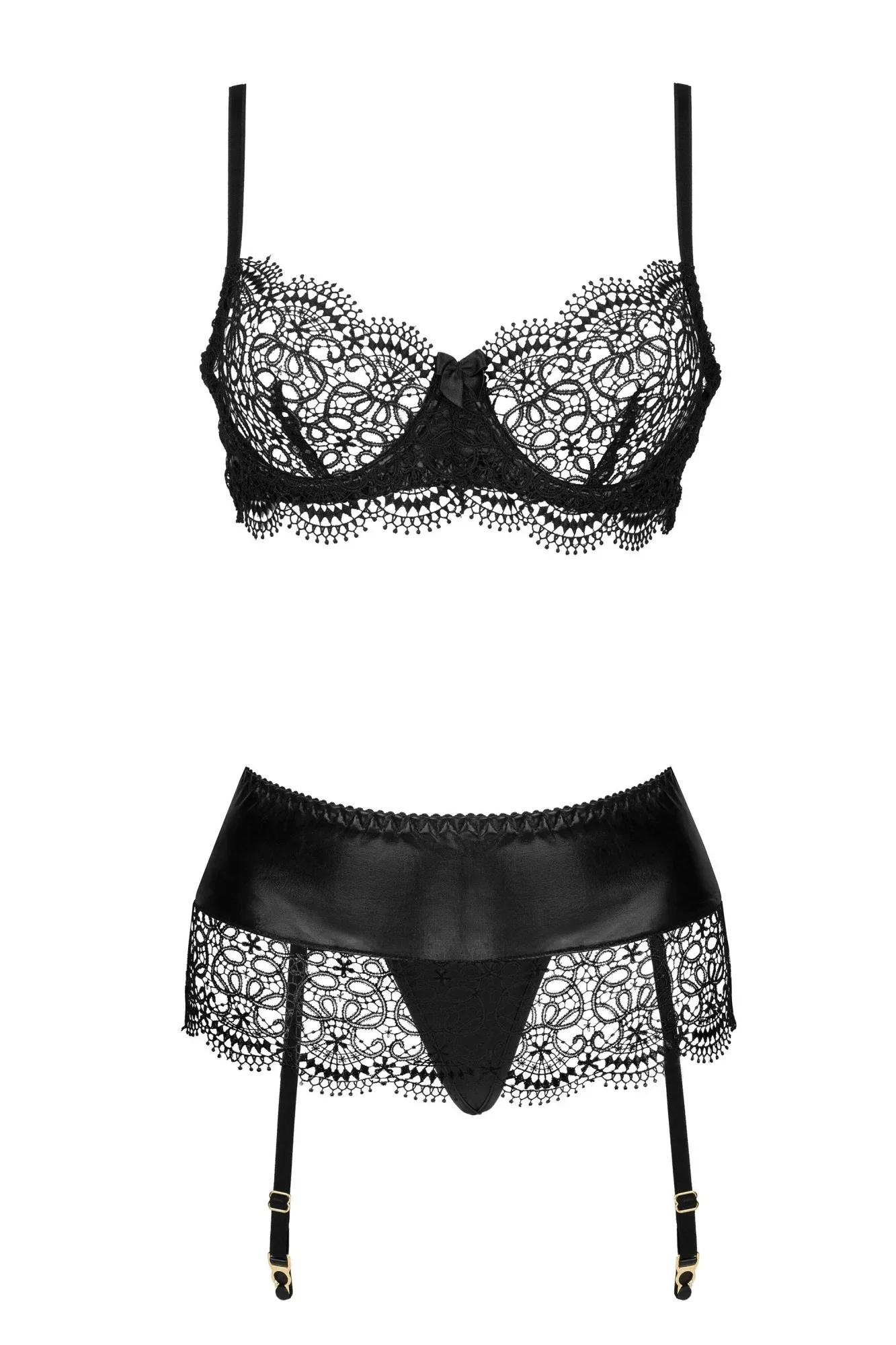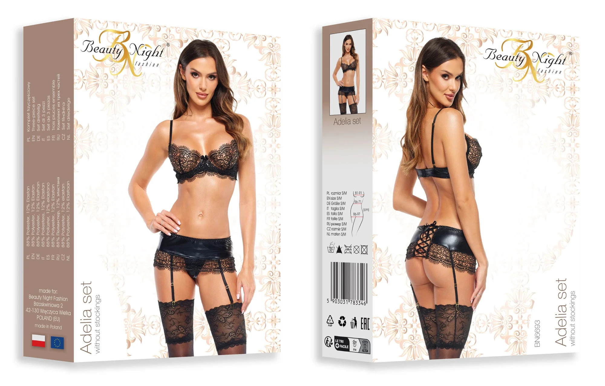 Dámská erotická souprava Adelia set BEAUTY NIGHT FASHION - černá barva - z latexového materiálu - podprsenka, podvazkový pás a tanga - podprsenka a spodní lem podvazkového pásu z průsvitné krajky - šněrování na hýždích
