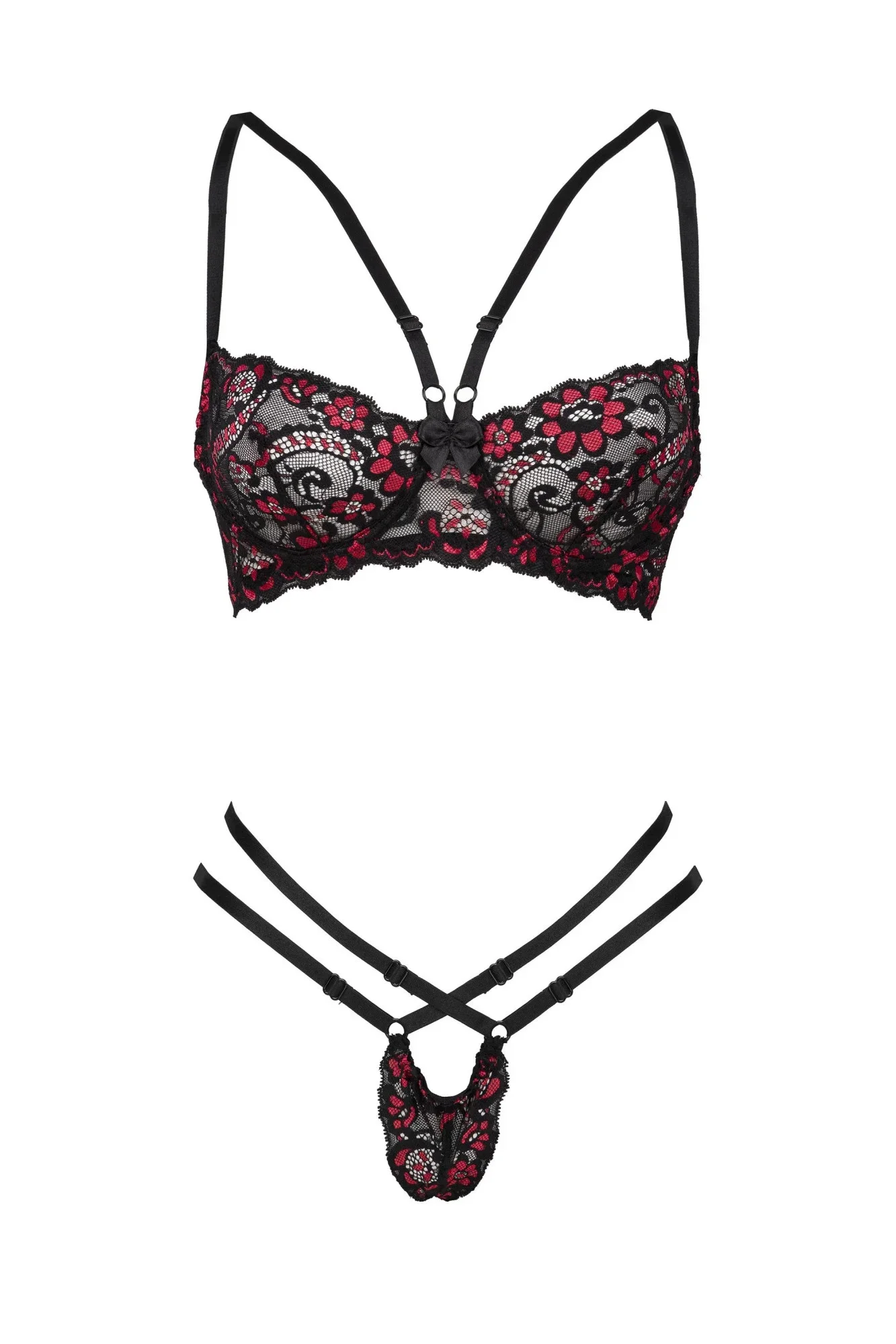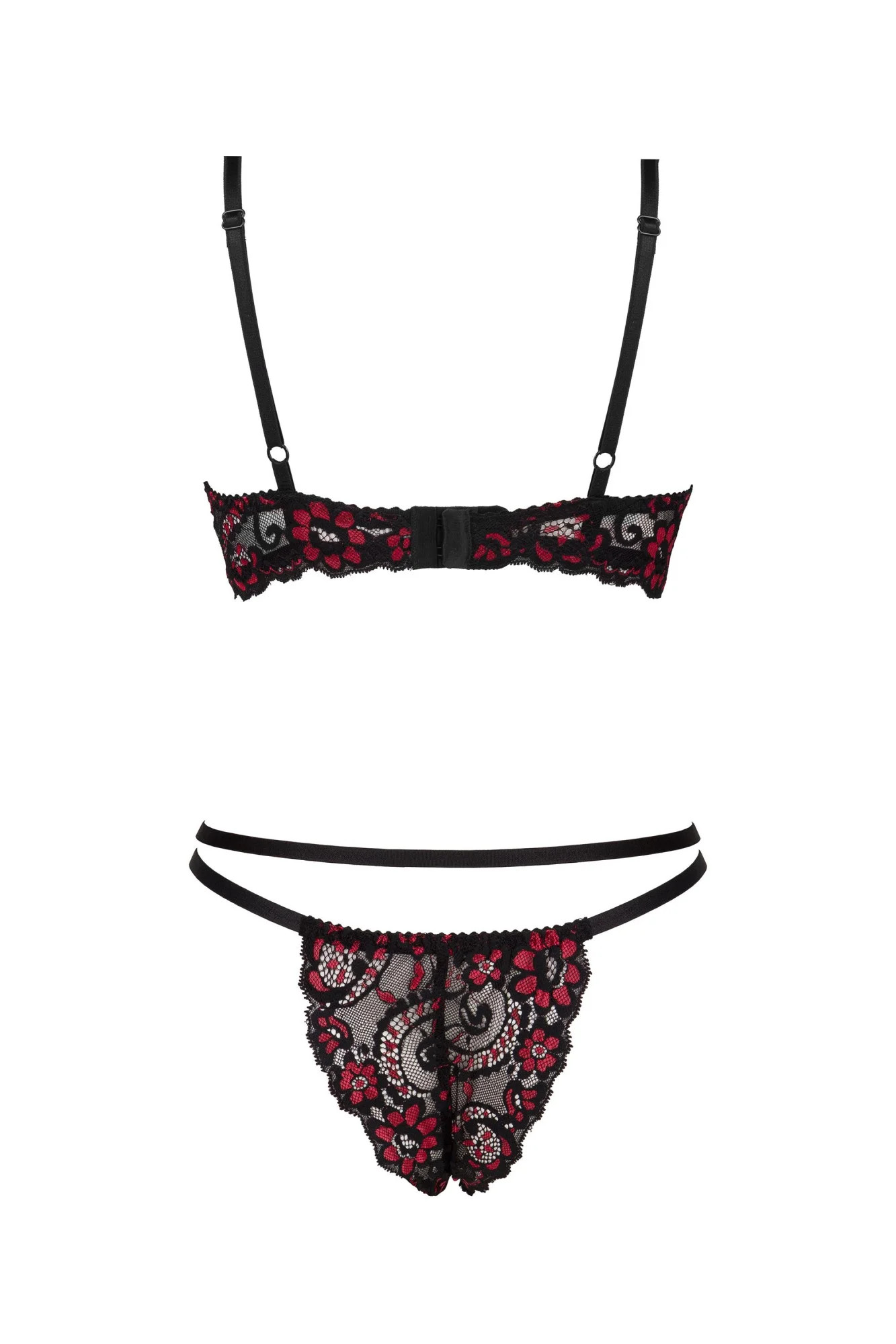 Dámská erotická souprava Rosalinda BEAUTY NIGHT FASHION - černá barva - z průsvitného mikrovlákna - zdobeného černou krajkou s červenými lesklými květy - nastavitelná ramínka - zapínání na háčky - tanga s nastavitelnými pásky