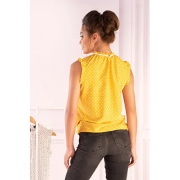 Okouzlující puntíkovaná halenka, která se stejně dobře hodí k ležérním džínům i jako elegantní verze pod sako. Model v krásné slunečné barvě, bez rukávů, zde zdobený volánkem. Pod krkem půvabná stuha převázaná mašlí. Složení: 95% polyester, 5% spandex.