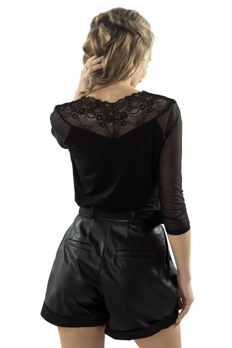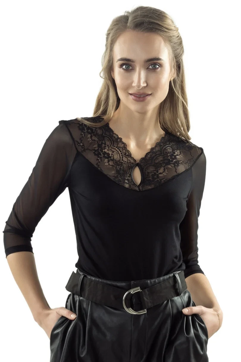 Elegantní halenka s 3/4 tylovými rukávy a odvážným výstřihem s květinovou krajkou sahající až na záda. Svůdný slzovitý výřez nad poprsím.