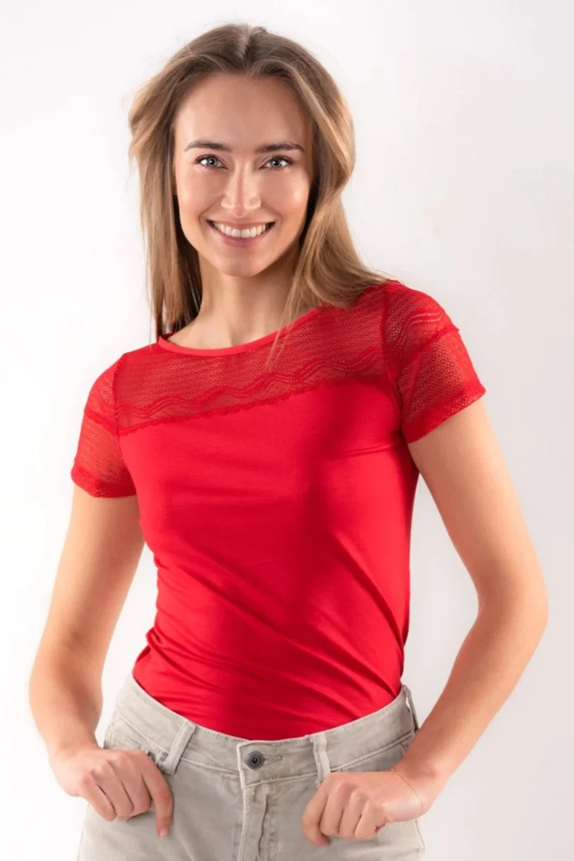Elegantní dámská halenka s krátkým rukávem. Výstřih z prolamované krajky a jemné síťoviny, zatímco záda jsou rovná a hladká.