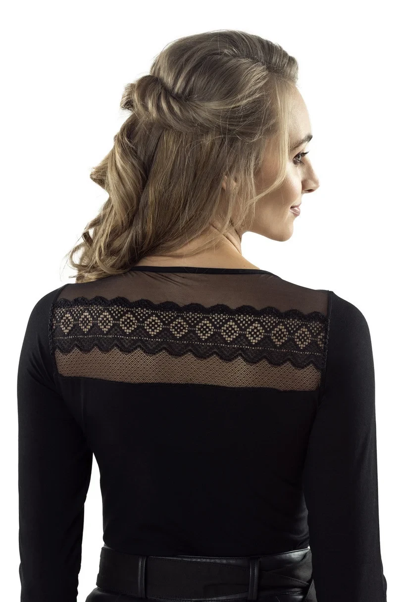 Přiléhavá, elegantní halenka z kombinace viskózy s krajkou a tylem. Průhledný výstřih s výřezem ve tvaru slzy. Krajková a tylová vsadka v horní části zad.