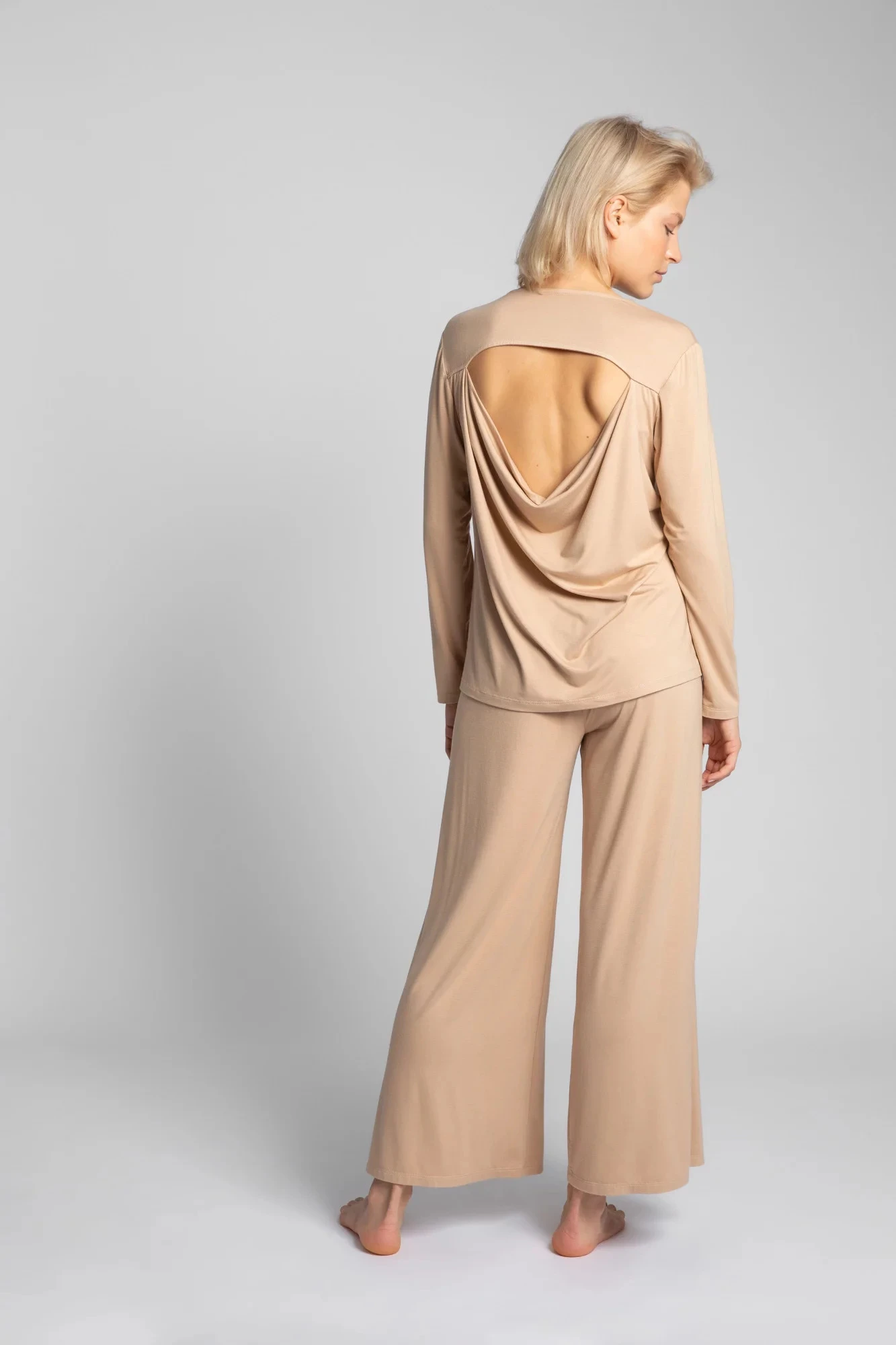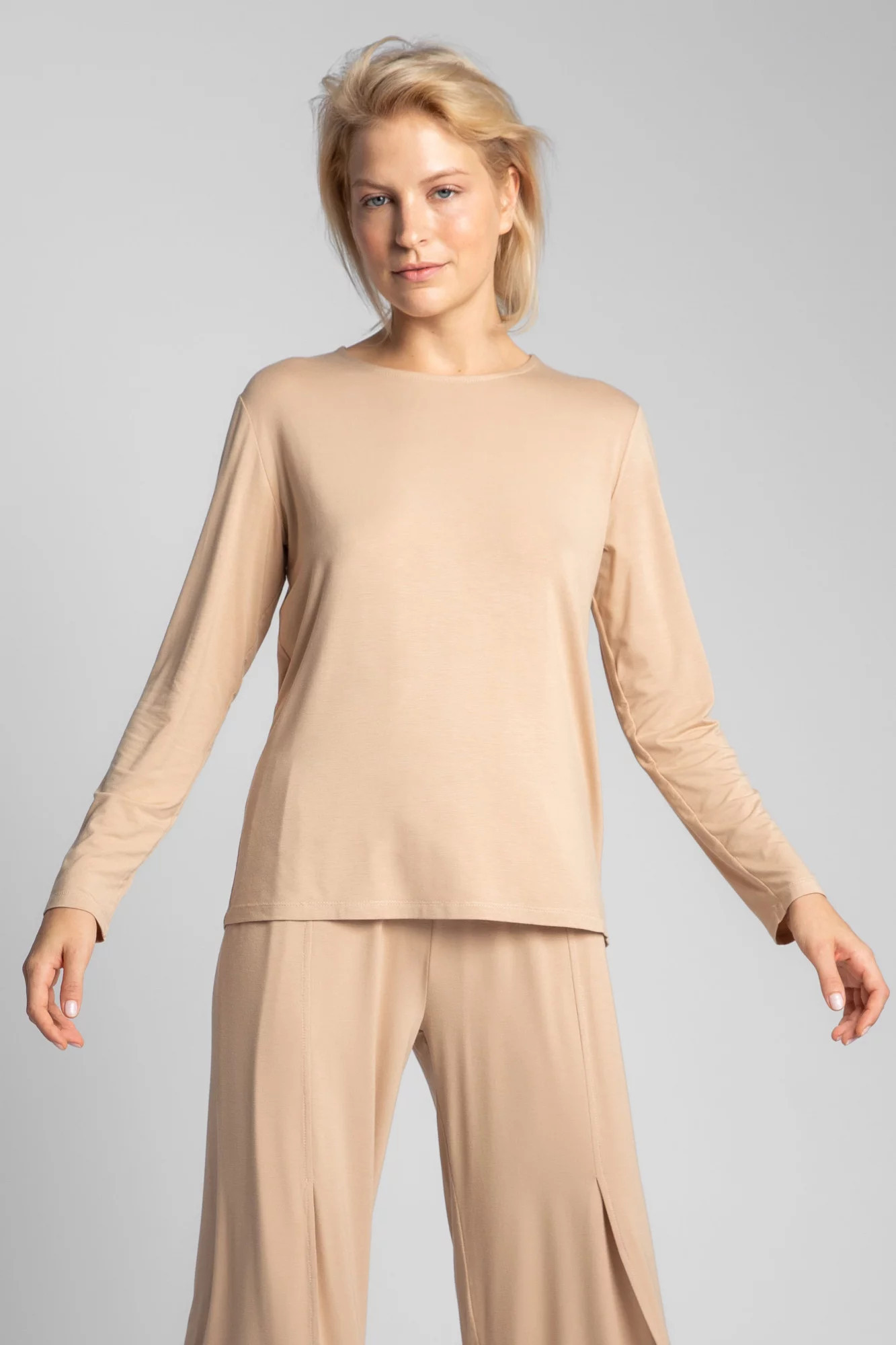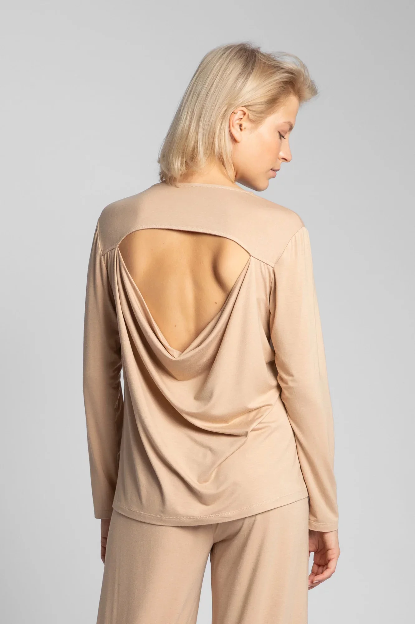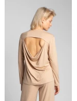 Dámský viskózový top s dlouhým rukávem. Přirozená měkkost a pružnost viskózy, na zádech s padavým kulatým výstřihem u krku, znamená luxus a eleganci.