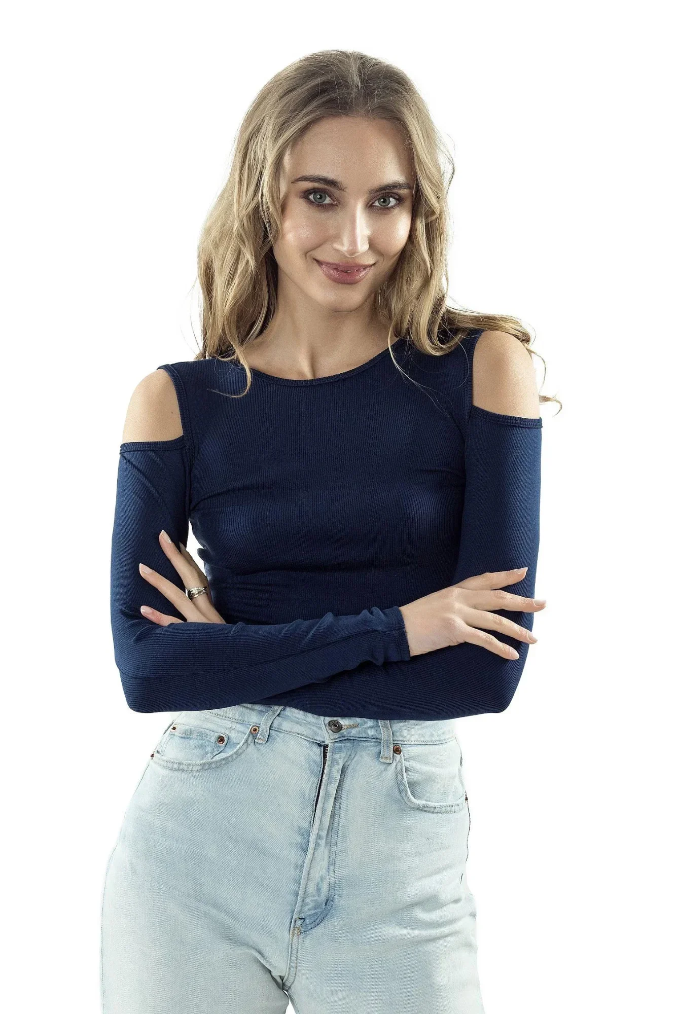 Dámská halenka Liv dark blue ELDAR - tmavě modrá barva - z vysoce kvalitní proužkované viskózy - dlouhé rukávy - odhalená ramenaMateriálové složení: 95% viskóza + 5% elastan
