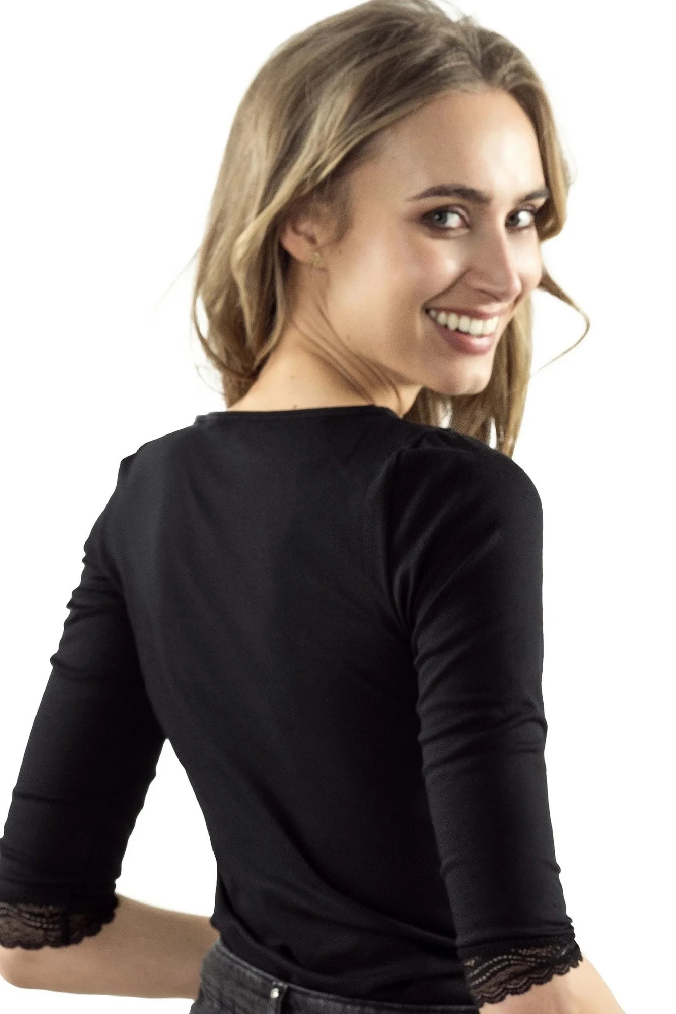 Dámská halenka Mati black ELDAR - černá barva - z vysoce jakostní bavlny - tříčtvrteční rukávy - výstřih z průhledného tylu a krajky