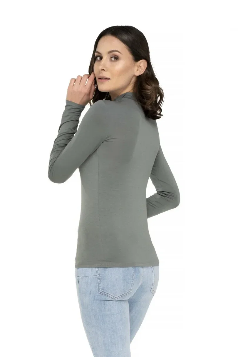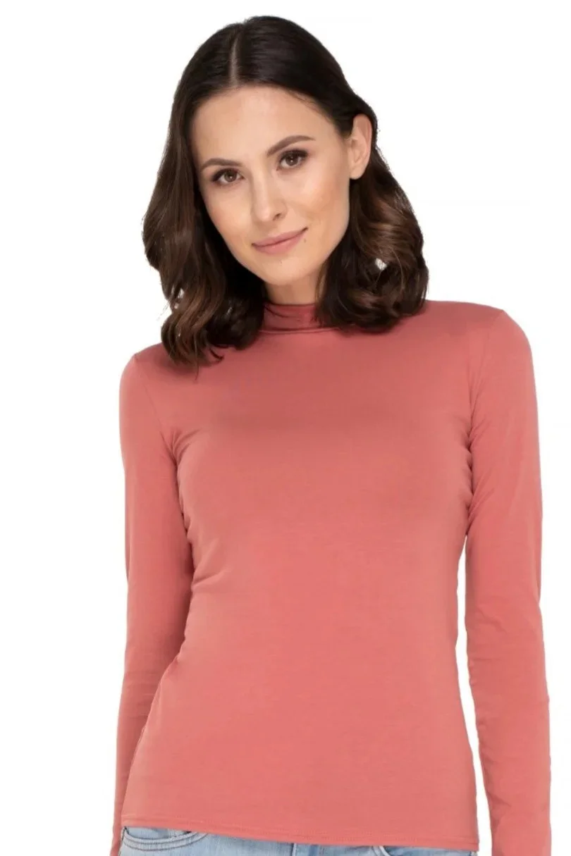 Dámské tričko z měkké viskózy s elastanem. S polorolákem, dlouhé rukávy. Přizpůsobí se tělu a poskytuje pohodlí při nošení. Celé tričko je hladké, takže ho lze použít pod barevná a vzorovaná saka. Výše uvedený výrobek je nejvyšší kvality, byl navržen podle nejnovějších módních trendů. Viskóza je materiál, který se dokonale přizpůsobí tělu, ale zároveň je prodyšný a šetrný k pokožce. Viskózová vlákna zaručují dobré tvarování, jsou prodyšná a příjemná na dotek. Říká se o nich, že spojují estetické vlastnosti hedvábí se snadnou údržbou bavlny.