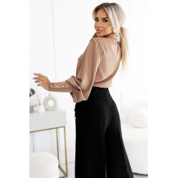 Dámská halenka 578-1 NUMOCO - světle hnědá barva - z kvalitního materiálu s jemným stříbrným vzorem - dlouhé volné rukávy - zakončené širokými manžetami se čtyřmi knoflíky - stylová mašle pod krkem