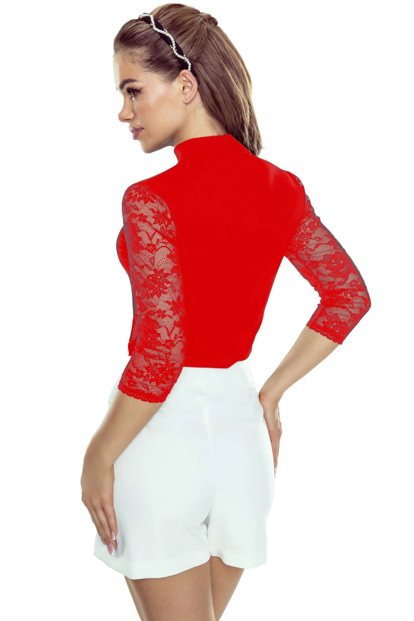 Dámská halenka Rafia red plus ELDAR - červená barva - z vysoce jakostní viskózy - výstřih se stojáčkem - tříčtvrteční rukávy z efektní krajky s květinovým motivem
